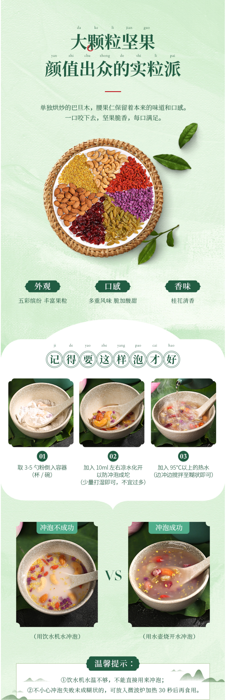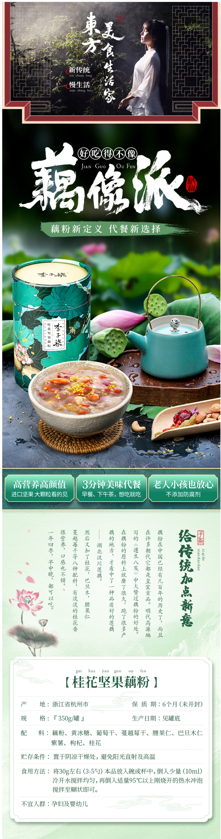这款李子柒 桂花坚果藕粉羹,是一款纯手工高端坚果莲藕粉,除了基础的藕粉外,还添加了黄冰糖、葡萄干、蔓越莓干、腰果仁、巴旦木仁、紫薯、枸杞、桂花而成,材料丰富,口感浓郁,营养充足。冲泡后口感清甜不腻,爽口润滑,无食品添加剂。
