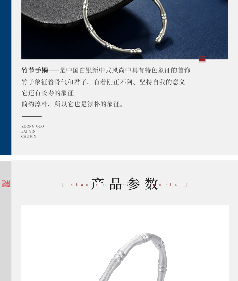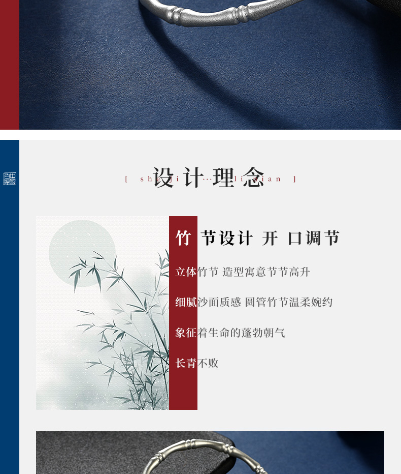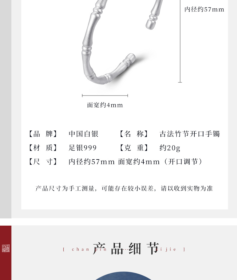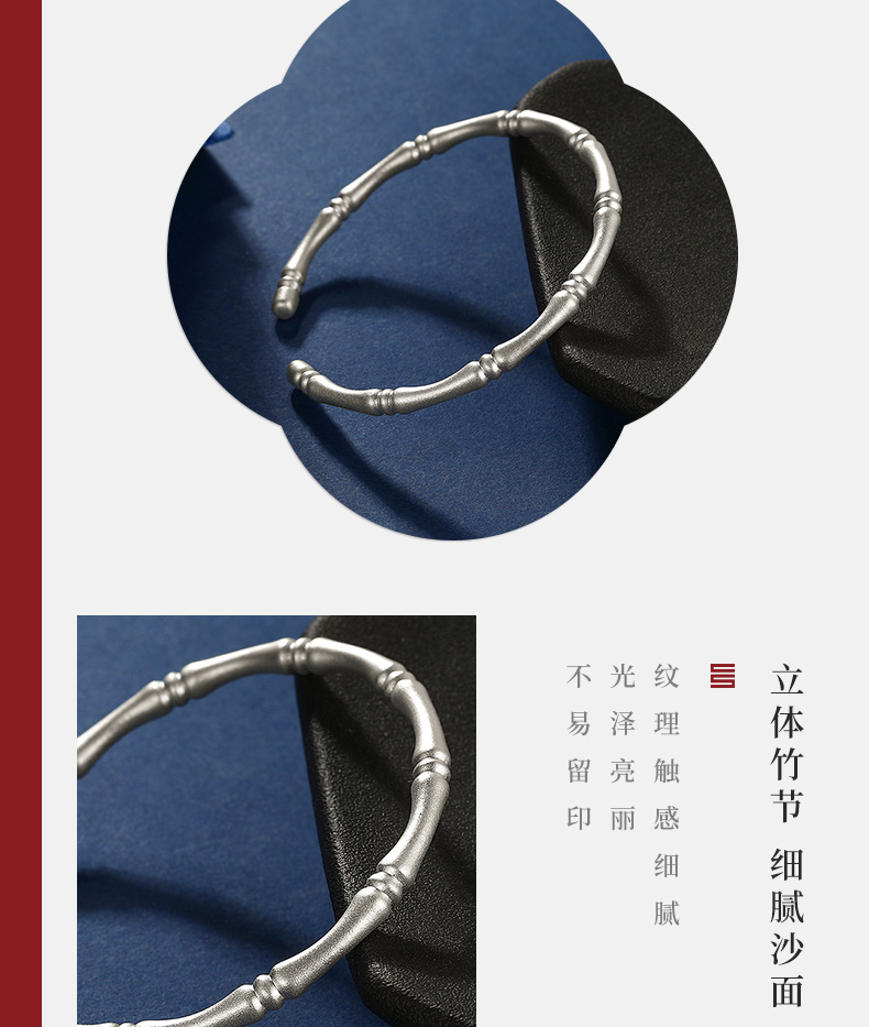 这款中国白银 足银999古法竹节开口手镯,重约20g,立体竹节造型,寓意节节高升,细腻沙面质感,圆管竹节,温柔婉约,象征着生命的蓬勃朝气,长青不败。内径约57mm,面宽约4mm,可开口调节。