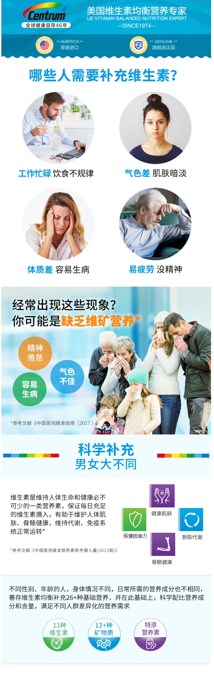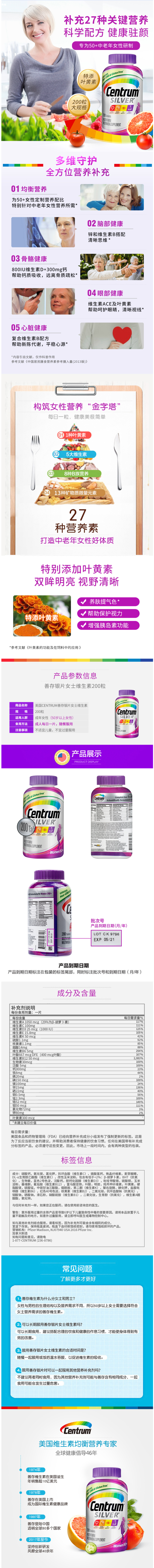 这款善存银片,美国原瓶进口,专为50岁以上中老年女士制定,复合13种维生、叶黄素、16种矿物质,富含钙、镁、硒等营养元素,加强了老年人所需的抗氧化营养素,有助增强免疫力,维护心血管健康,保护大脑,适合眼睛容易疲劳干涩、易疲劳、体力下降,易焦虑人群。