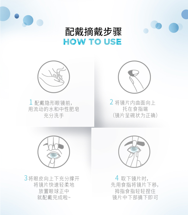 低镜片设计,减少眨眼间与镜片的摩擦,有效降低异物感,增加瞬目的舒适度;镜片边缘采用干式膜铸工艺,使表面更加光滑,成形性好,更易于操作,对初期佩戴者尤其方便。