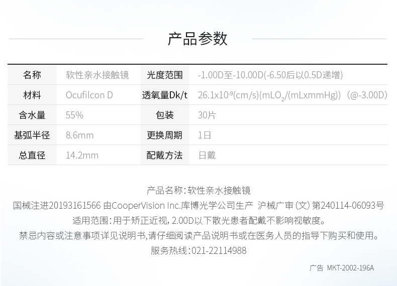 这款隐形眼镜中心厚度只有0.07mm,含水量高达52%,高效缩水,去干涩;添加紫外线吸收剂,能够有效阻挡70%的UVA以及96%的UVB,时刻保护眼睛,更周全;