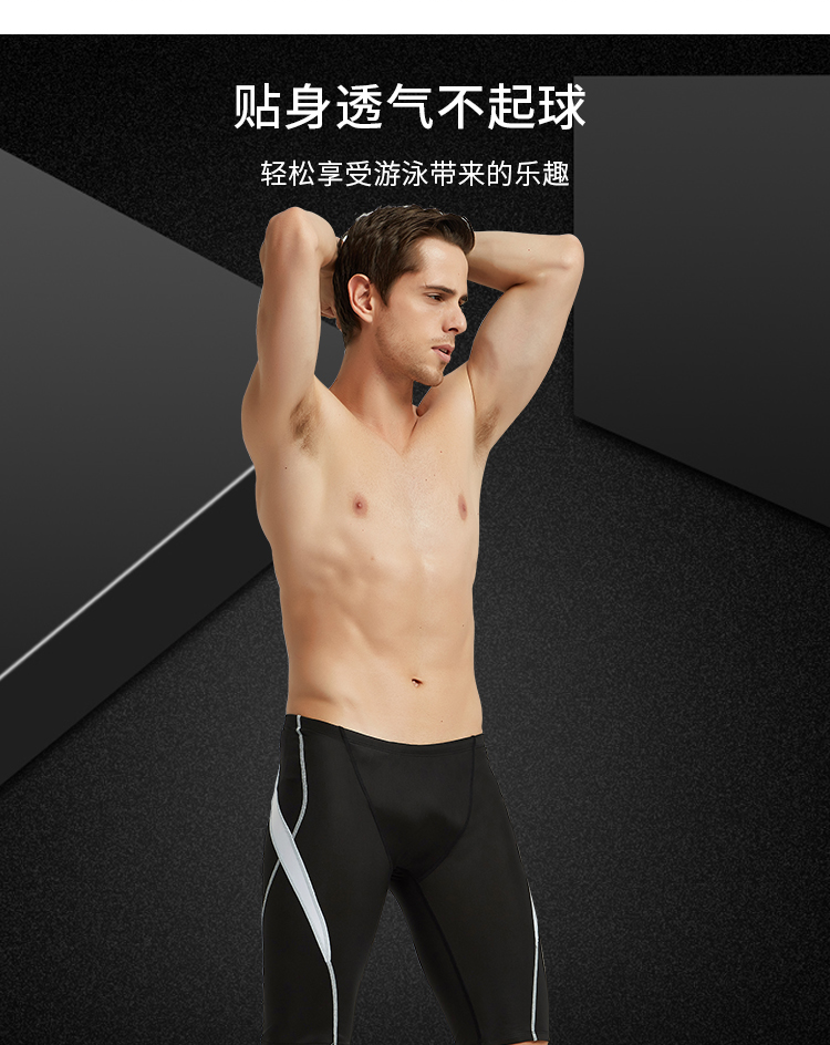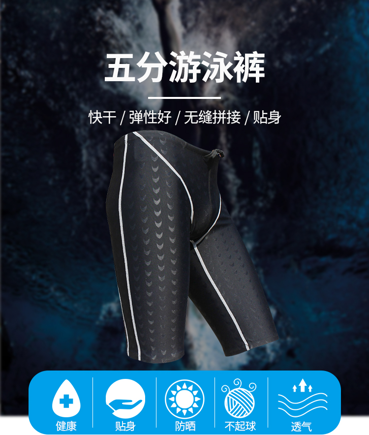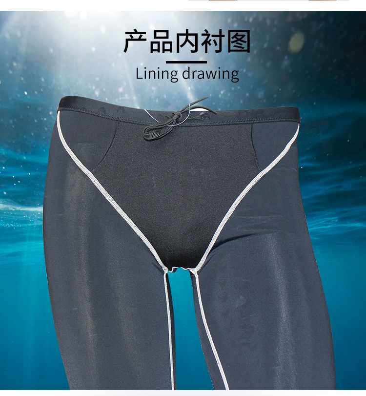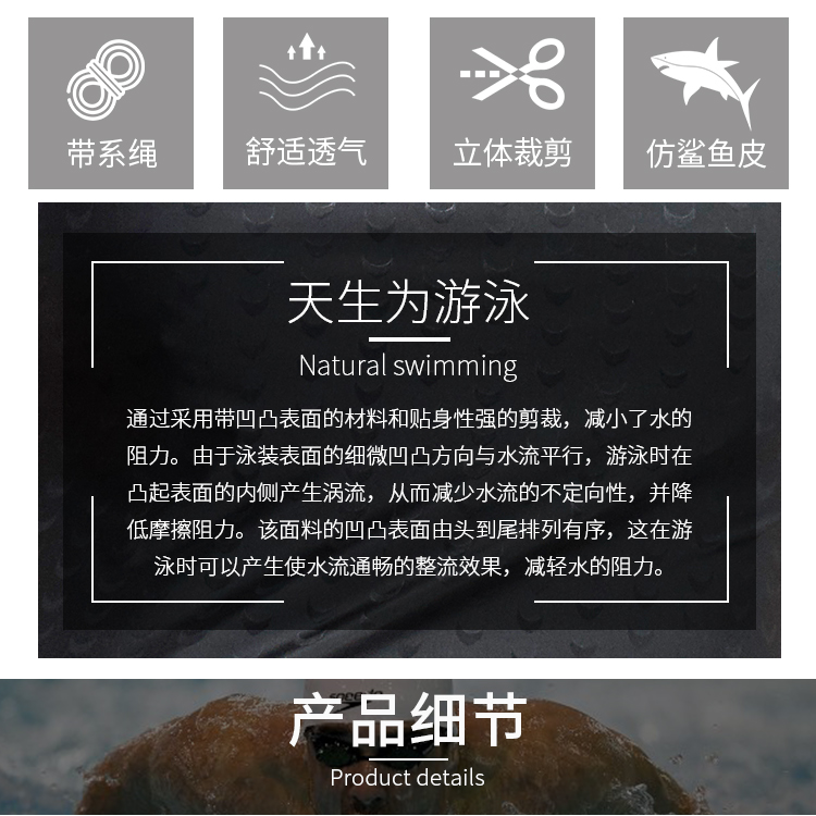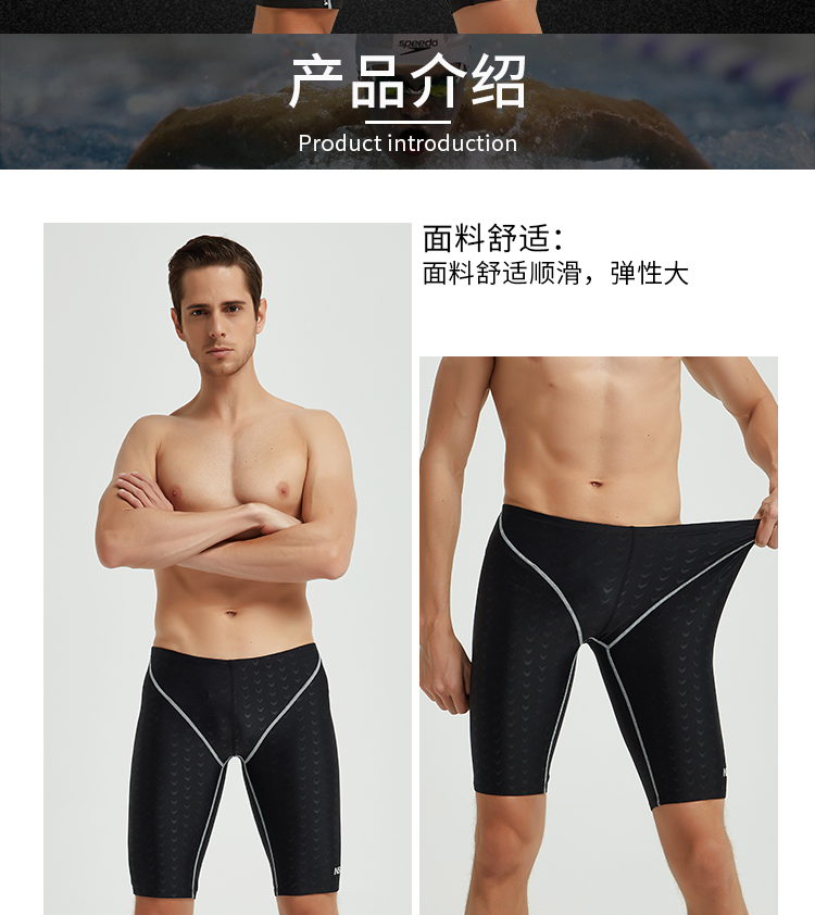 这款泳裤使用了,NSA的仿鲨鱼皮面料,主要就是耐久、耐氯、透气、柔软,性价比非常高,布料表面鱼鳞状的小水涡和不浸水设计,使泳装表面的水涡成为通畅的水流,降低表面摩擦阻力,速干不沾水,想鱼一样顺滑。