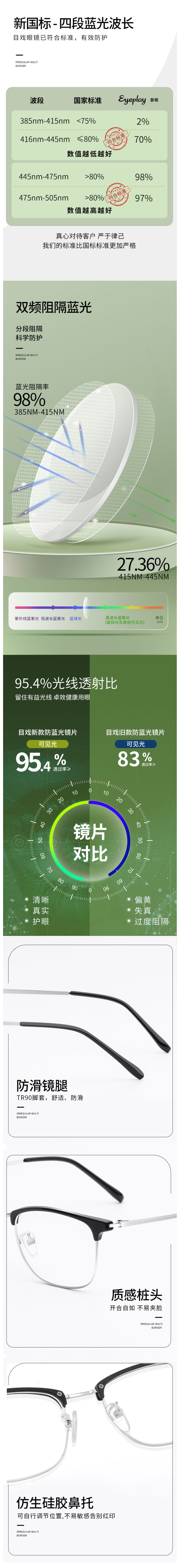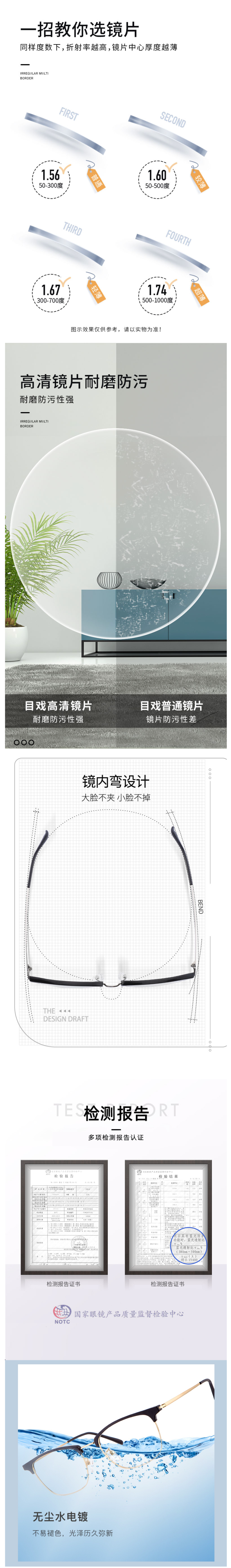 新国标防蓝光镜片,还有1.60、1.67镜片可选。新国标防蓝光镜片 轻至10克 可配度数。