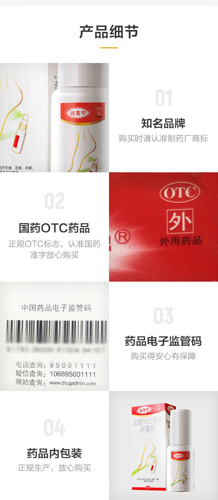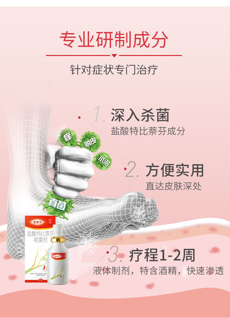 这款达克宁 盐酸特比萘芬喷剂,针对症状专门研制,主要成分盐酸特比萘芬,能深入杀菌专治脚气,液体制剂,特含酒精,喷涂后能快速渗透。