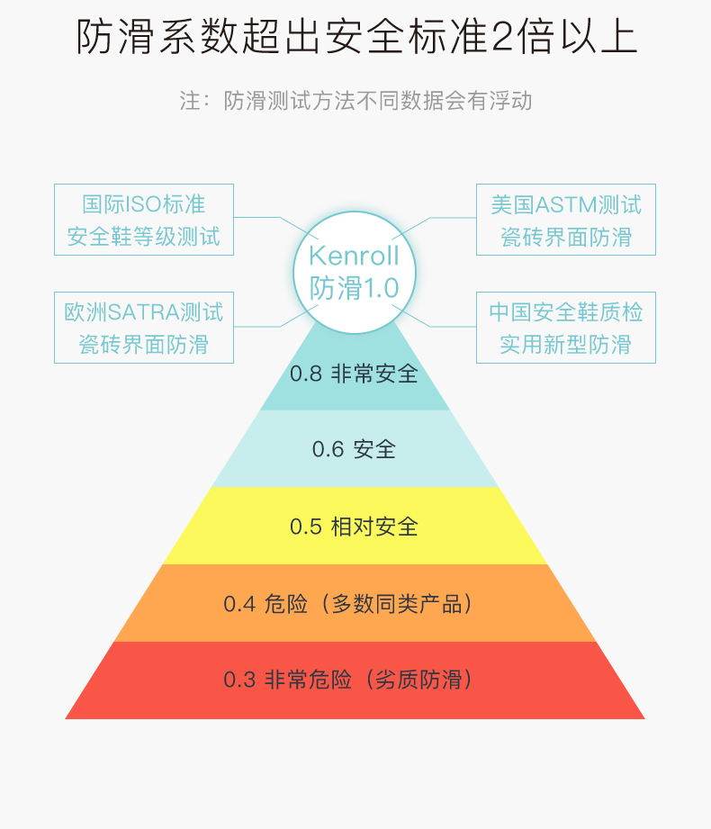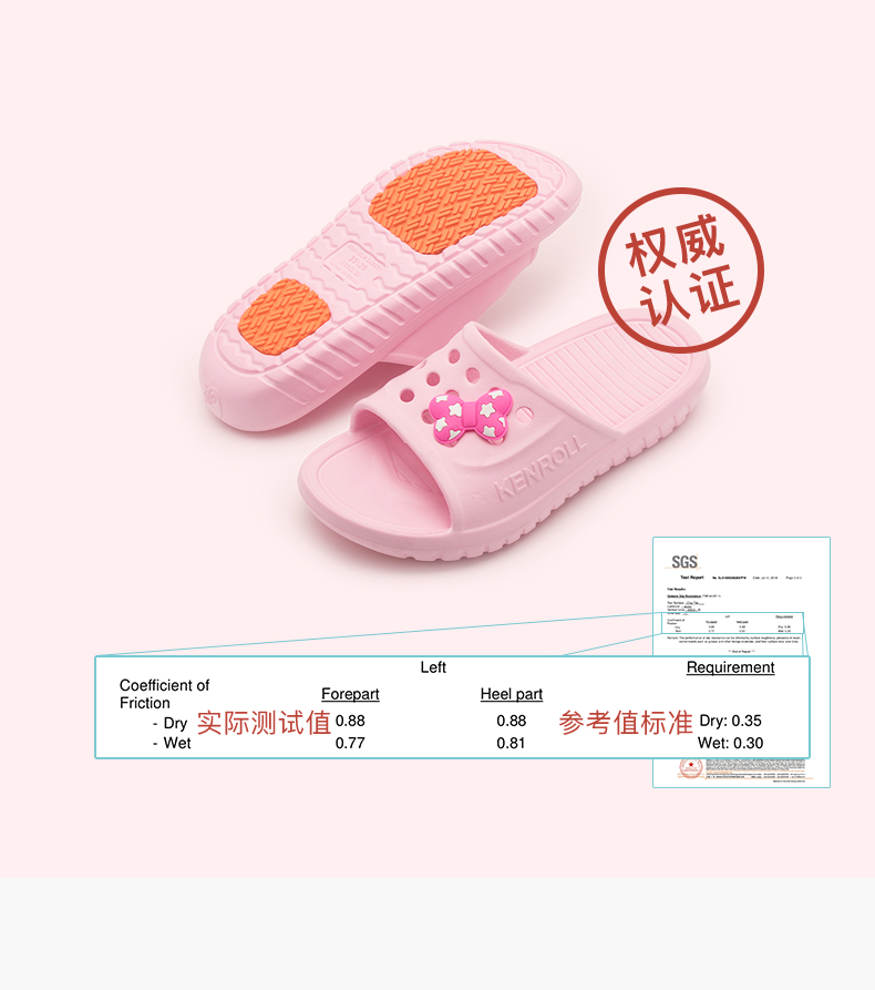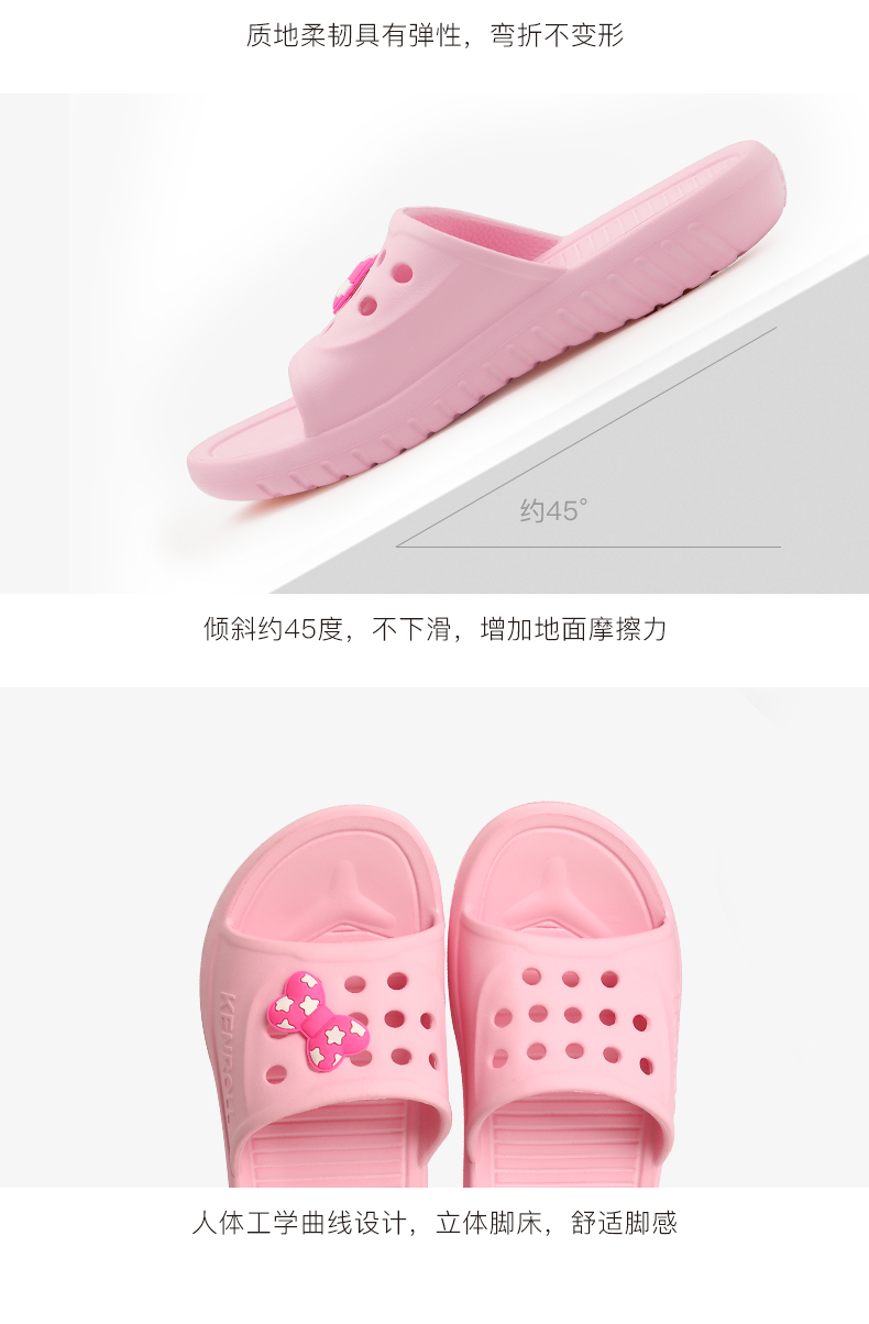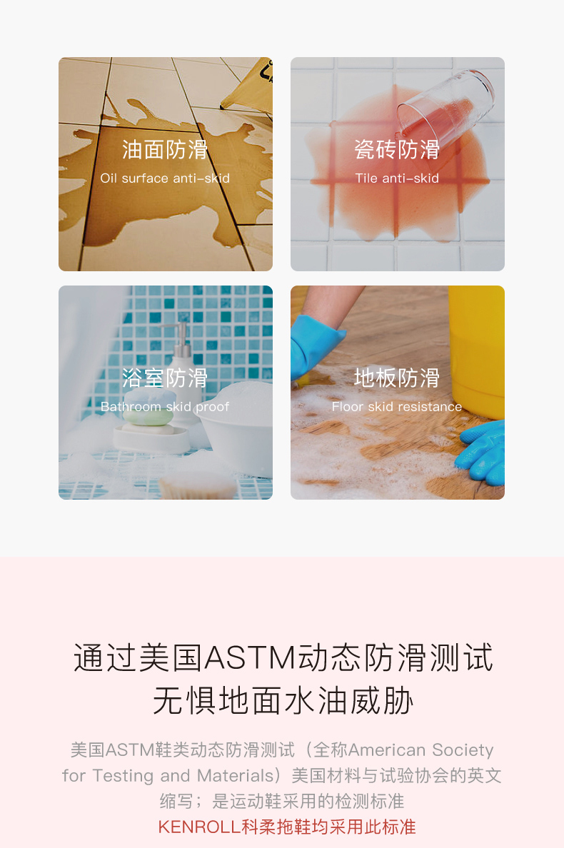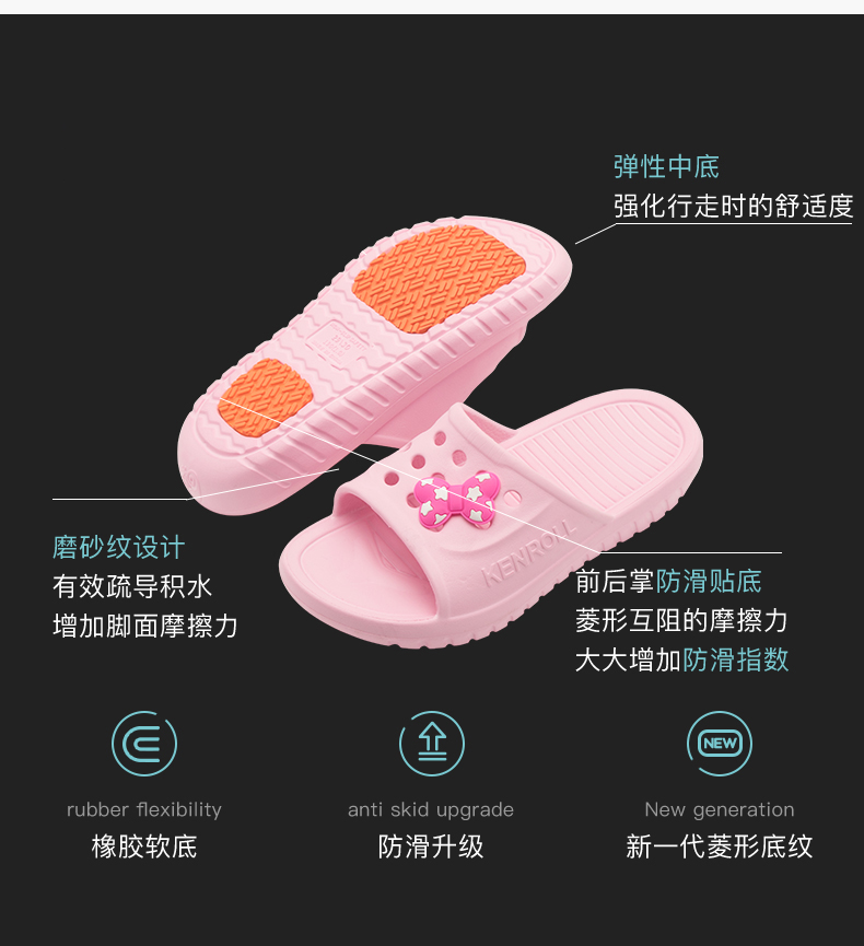 天猫kenroll多边专卖店75元,可领30元优惠券,实付45元到手,科柔的核心卖点是鞋底的防滑贴片,通过美国ASTM动态防滑测试,无惧地面水油威胁。特制橡胶能迅速引导水膜分散,加上前后掌三角形和圆形相间防滑纹路,无论是瓷砖、大理石、油污、沐浴露、洗发水地面,防滑效果都足够好。尤其适合老人小孩孕妇穿。