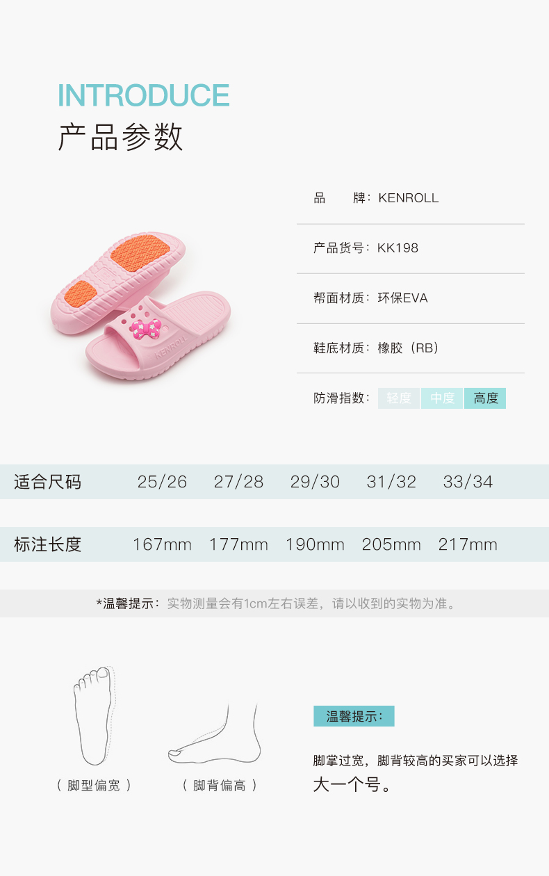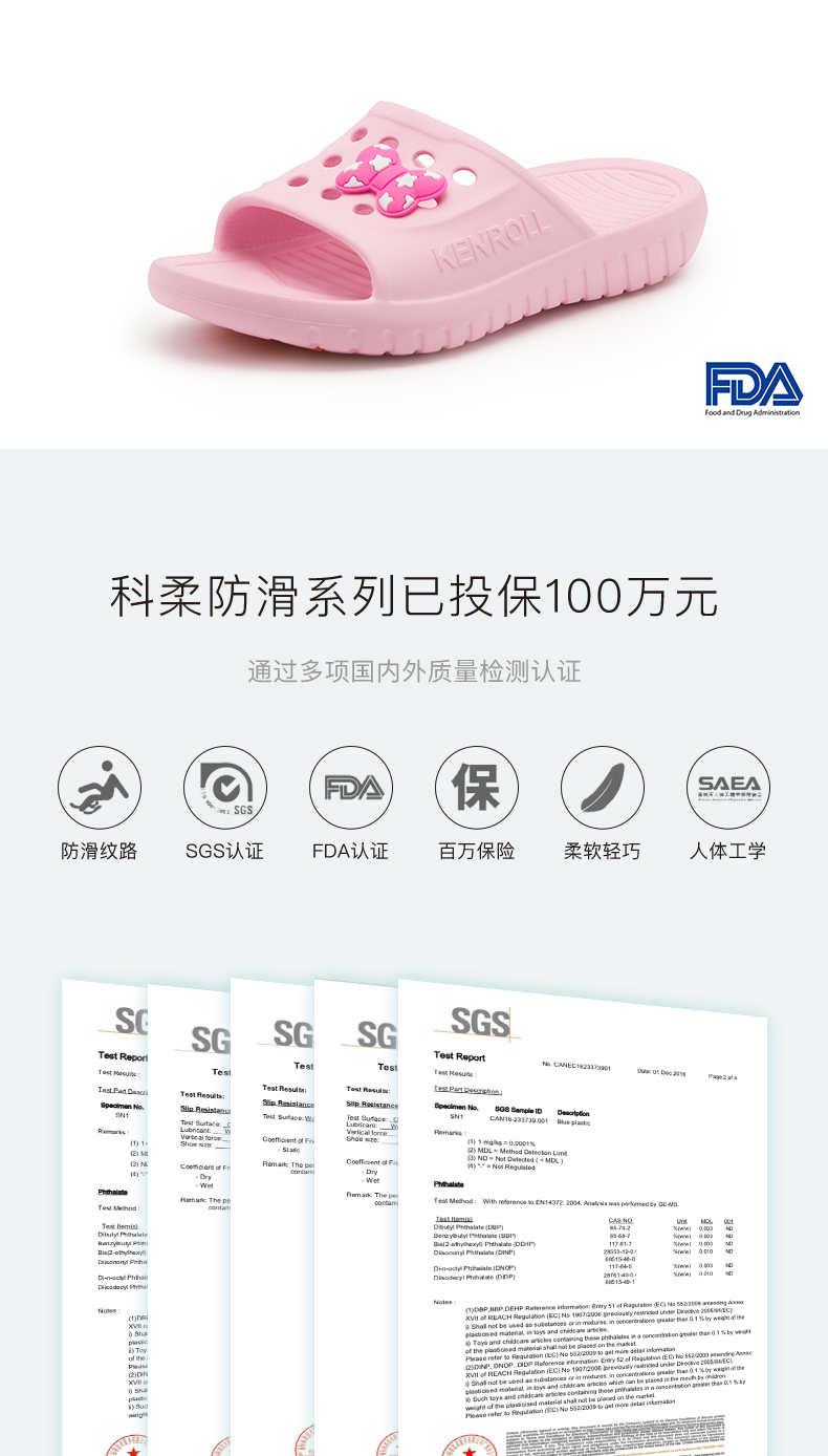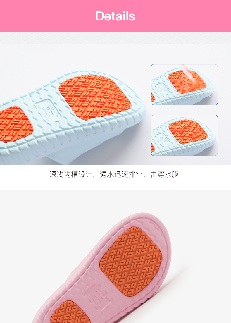 科柔/Kenroll是专注防滑拖鞋的品牌,鞋身使用一体成型EVA材质,鞋床贴合足弓,脚掌带排水孔。科柔的核心卖点是鞋底的防滑贴片,特制橡胶能迅速引导水膜分散,加上三角形和圆形相间防滑纹路,无论是瓷砖、大理石、油污、沐浴露、洗发水地面,防滑效果都足够好。尤其适合老人小孩孕妇穿。