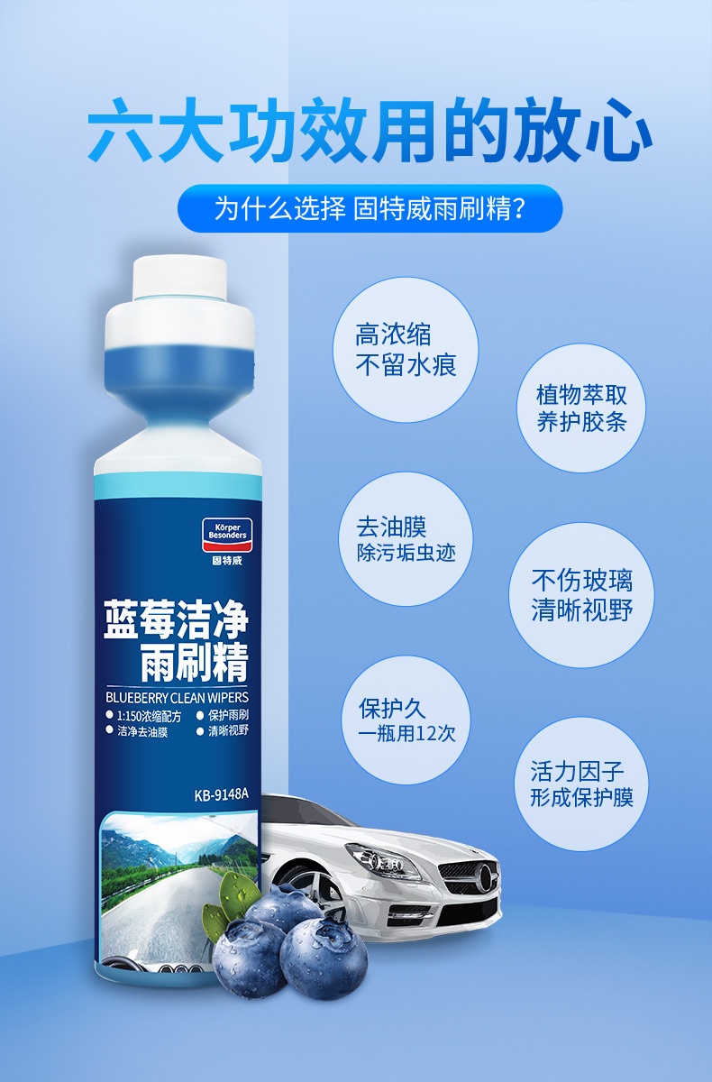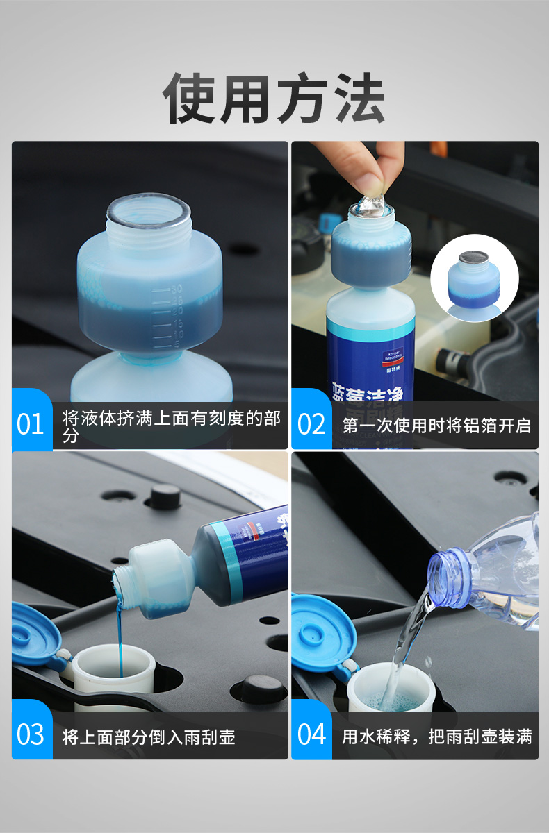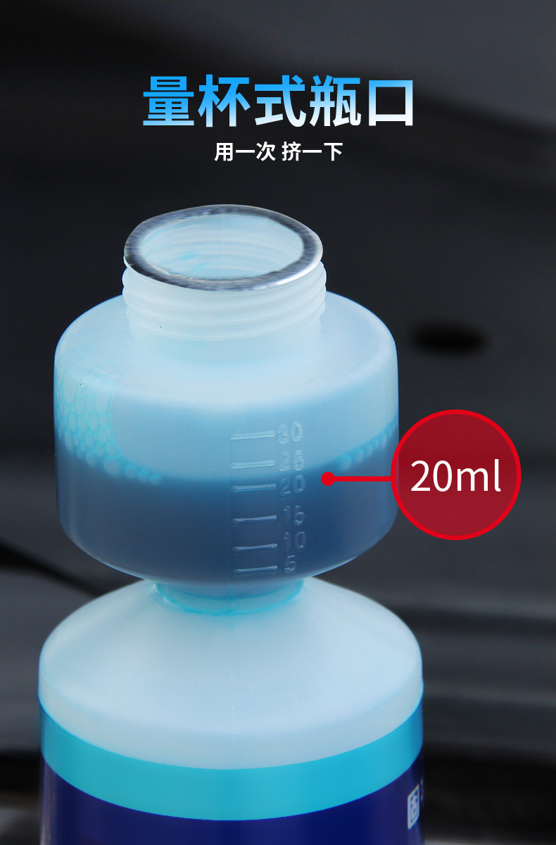 1:150的超浓缩液,强力安全去污,不留水痕,清晰视野。性价比高,使用方法简单,就是先倒入浓缩雨刷精,然后直接到清水就好,最高比例是1:150,如果有强力清洁的需要,降低浓缩比例即可。