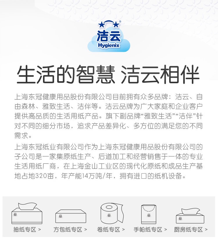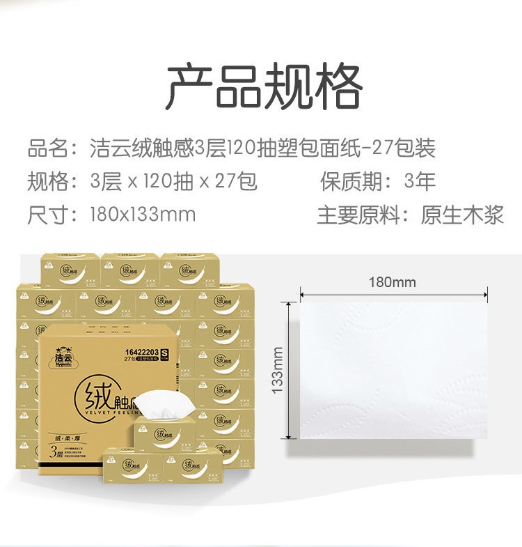 这款洁云 绒触感抽纸,采用巴西进口的桉树原生木浆制成,采用GBPM精柔成纸工艺,不添加荧光剂、增白剂,细腻柔软,舒适亲肤不刺激。