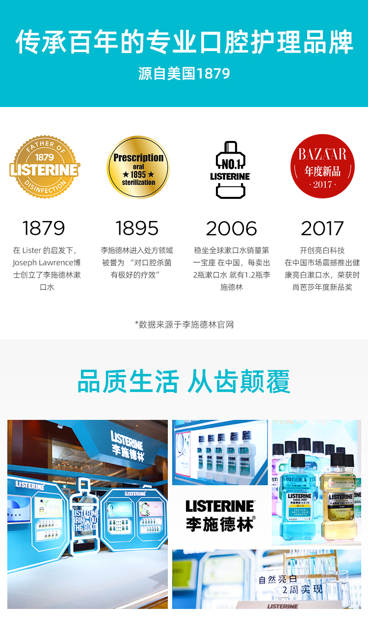 提起漱口水,那么李施德林在这行业可谓响当当!李施德林拥有125年的历史,它以消毒之父Joseph Lister命名。李施德林一直坚持其杀菌的核心功效,是第一个被美国牙医学会认可的非处方品牌漱口水。