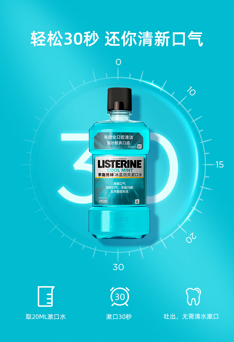 李施德林漱口水,可深入清洁口腔内部难刷部位,杀灭隐藏在牙缝间及刷牙后残留的细菌,比单靠刷牙更能有效减少牙垢膜及牙龈炎的形成。