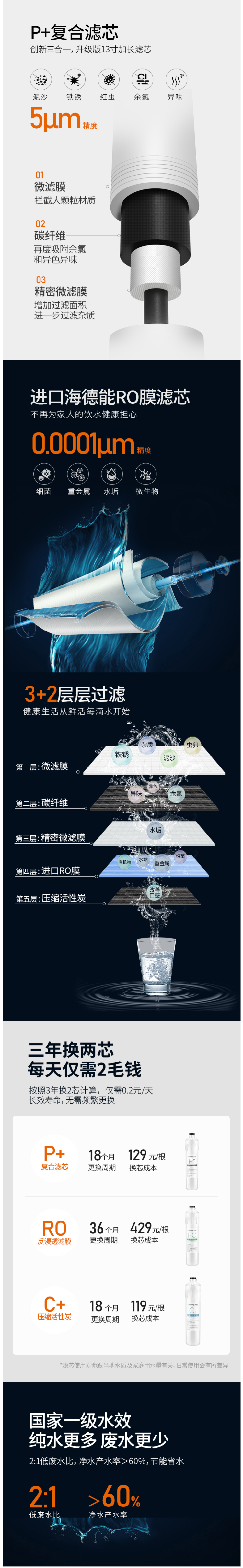 美国进口的RO反渗透过滤膜,过滤精度为0.0001微米,可以彻底滤除颗粒泥沙、胶体、铁锈、细菌病毒、水垢、重金属等,所过滤的水都是活水,有效避免二次污染。经过五层强效过滤后,可去除99.9%有机物和99.9%重金属。