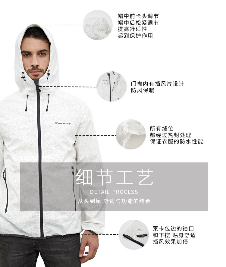Amurcamp纸感系列冲锋衣,防水指数10000mm可防暴雨,直接当雨衣穿,透湿指数高达10000g激烈运动可穿;使用新颖的纸感面料,轻薄程度接近于纸,把冲锋衣的功能做到轻型风衣的重量,230克重量不到传统冲锋衣的一半。还拥有UPF 50+的50倍防晒功能。