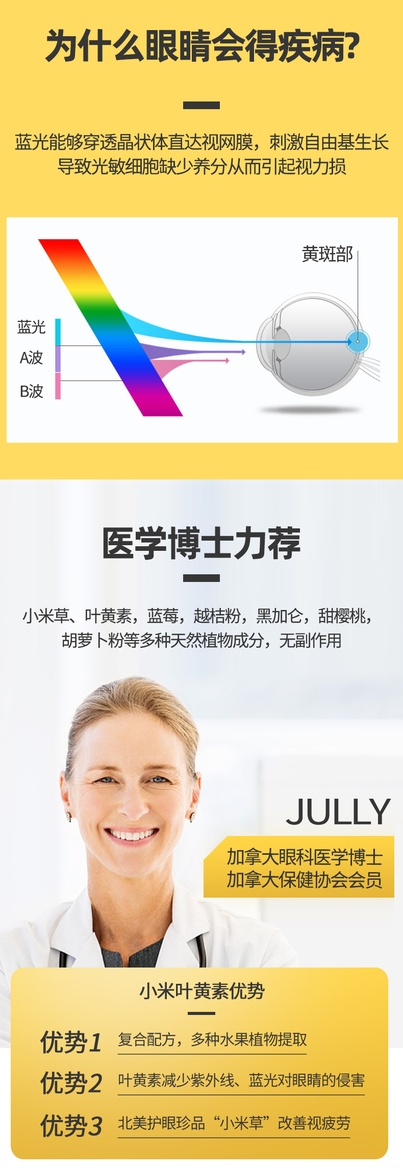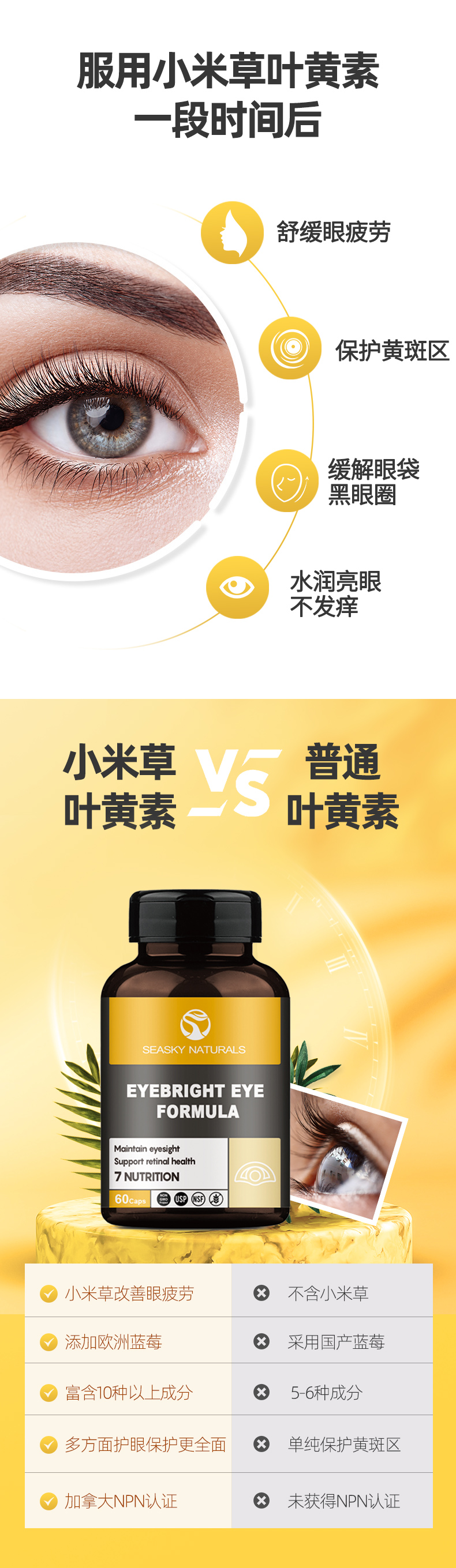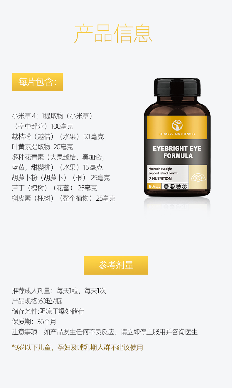 加拿大原装进口,品牌直供,复合配方,含有小米草、叶黄素,蓝莓,越桔粉,黑加仑,甜樱桃,胡萝卜粉等10余种天然植物成分,安全无副作用,预防近视弱视,缓解眼睛干涩和疲劳,上班族、学生党等必备。