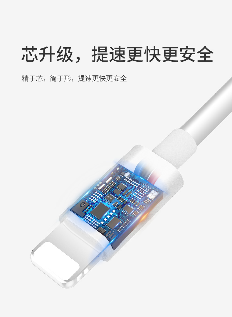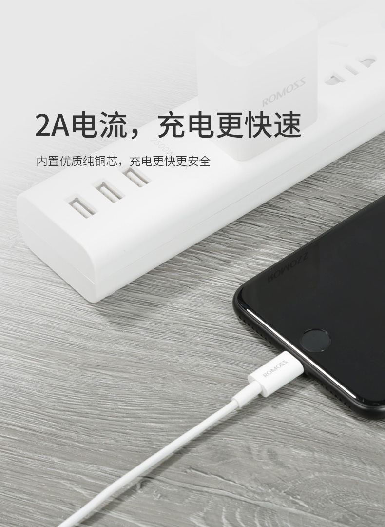 这款罗马仕 Lighting 数据线,线长1m,兼容IOS 9、10、11、12系统,内里是优质纯铜芯,能有2A电流,充电会更快。内置智能芯片可以从急速闪充到涓流充电,还能根据手机电池容量大小,自动调节输入电量的大小,保护电池。
