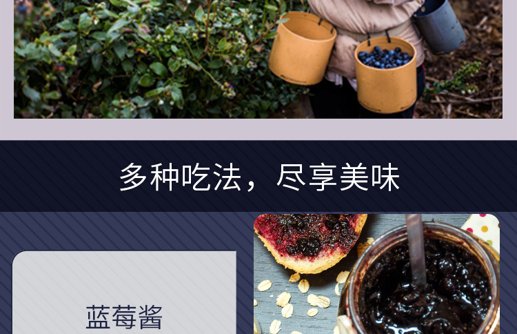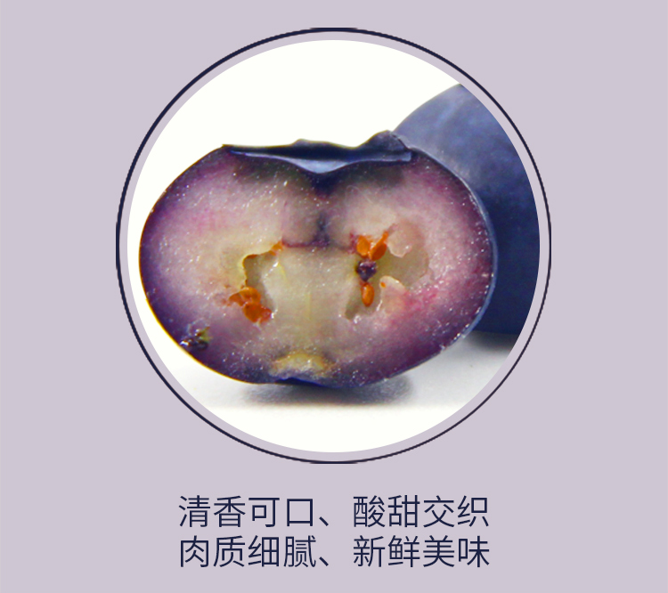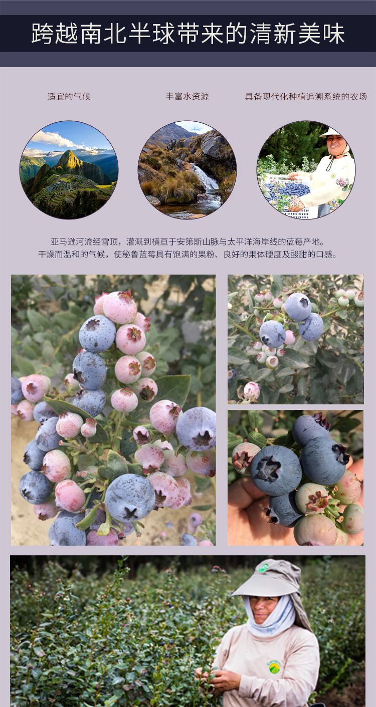 此款蓝莓源自秘鲁果园,由于当地昼夜温差大,加上肥沃的土壤,汁水充盈,酸爽爆棚,让蓝莓酸中带甜,脆嫩爽口多汁。果香清香宜人,芬芳馥郁。果径: 13mm(含)-17mm(不含)。
