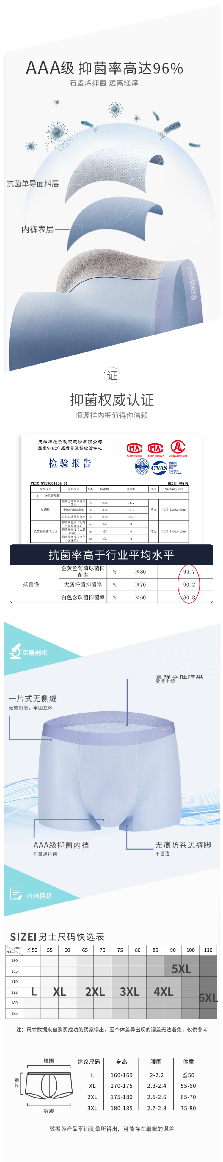裆部是93.5%粘纤+6.5%氨纶弹性,亲肤性和柔肤度比聚酯更好,对皮肤无任何刺激。同时添加了石墨烯成分,能抗菌,级别达到AAA级、抑菌率达96%。这点对于男性私处来说是非常重要的。