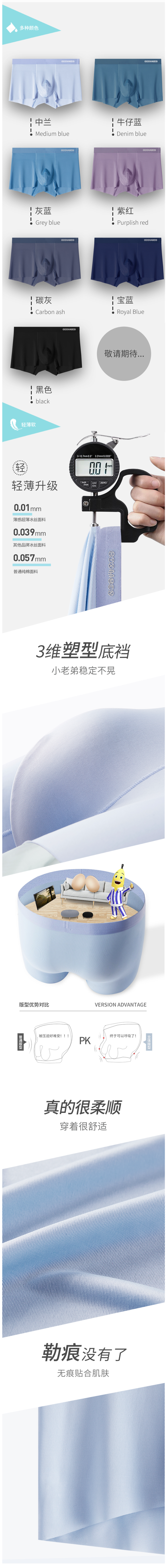 这款恒源祥男冰丝弹力薄平角无痕内裤,是2021年的新款,大身使用92%聚酯纤维/冰丝+8%氨纶弹混纺而成,摸着柔软舒适,上身吸湿速干透气有凉感,弹力也好,上身不紧绷。