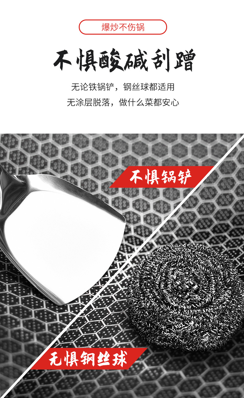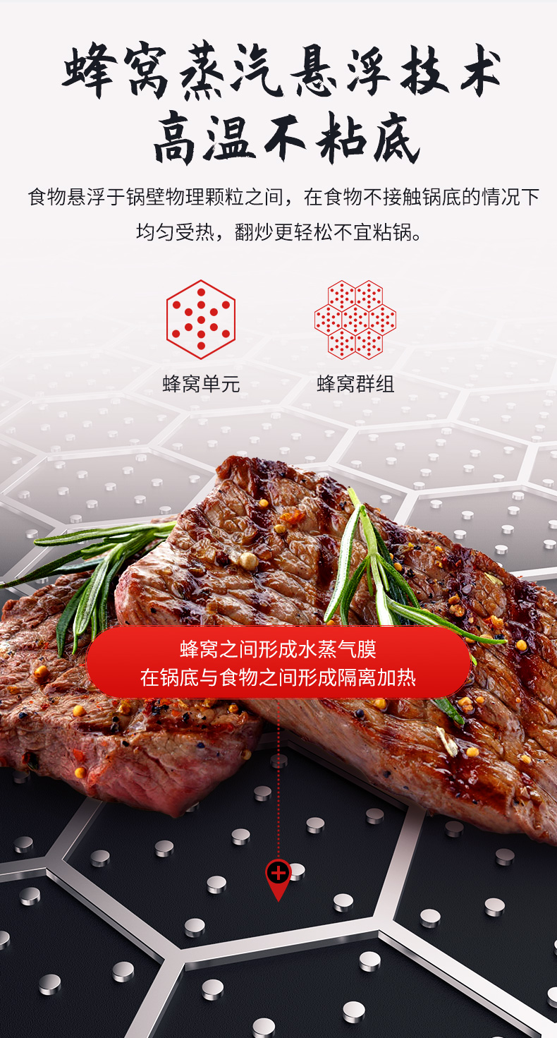 内层采用蜂窝悬浮技术,没有普通不粘锅的涂层,蜂窝纹之间会产生水蒸气膜,会使食物不接触锅底情况下受热均匀,翻炒轻松,不易粘锅,且能减少油烟、也不怕钢丝球破坏,极大提升不粘性能。