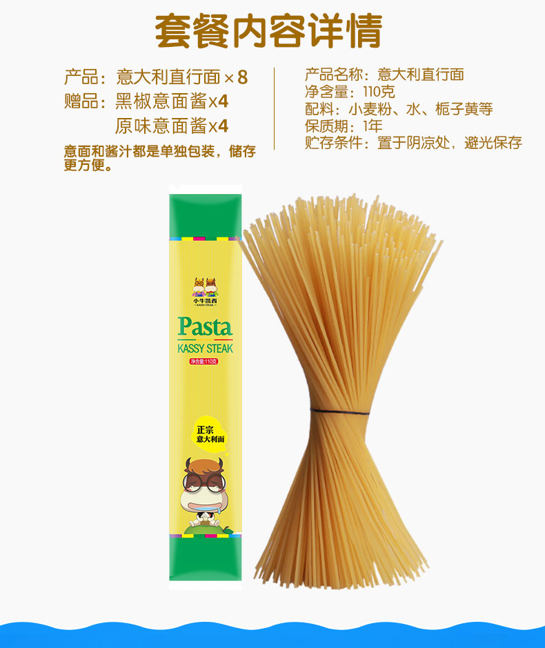 这款小牛凯西 意大利面套餐组合,规格: 110g*8份,内含:意面110克+黑椒意面酱120克*4份、意面110克+原味意面酱120克*4份。采用硬质粗粒杜兰小麦粉精致而成,口感筋道,营养丰富;搭配专属酱料,香味浓郁,Q弹爽滑。