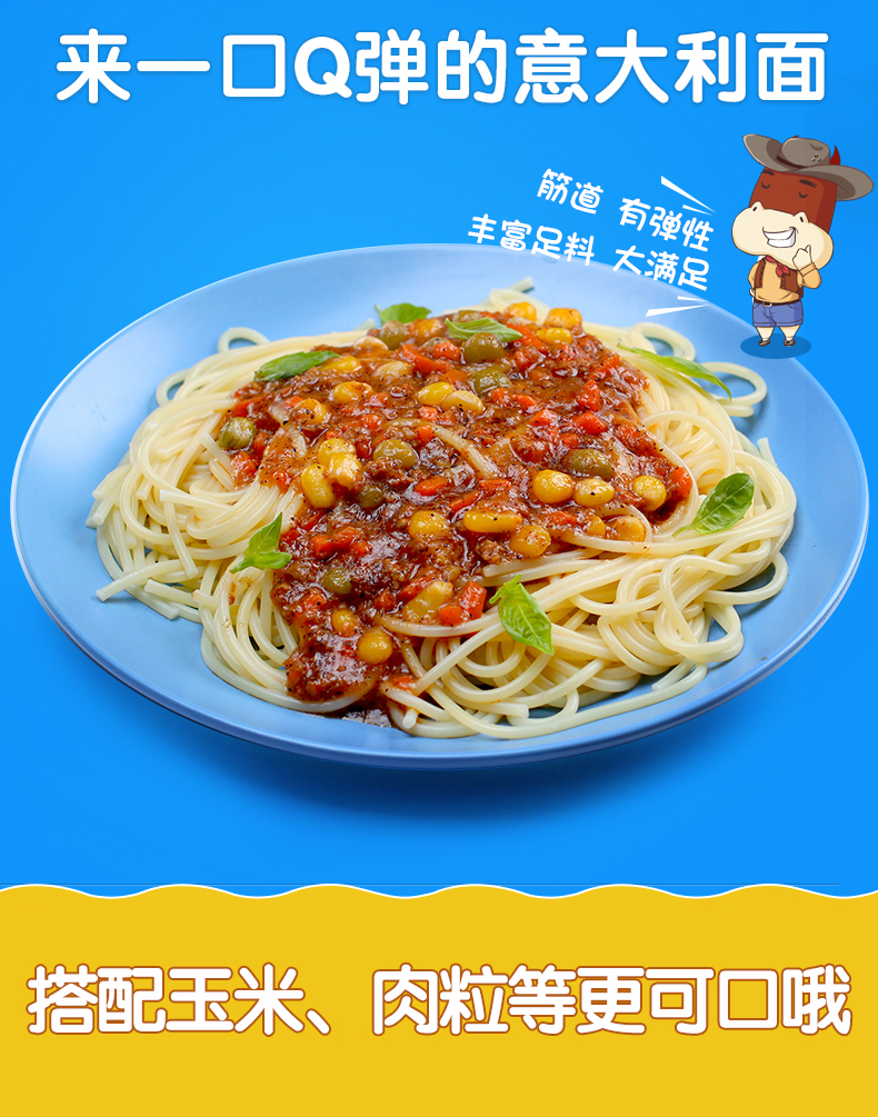 超市同款,原装进口意大利面,品质好的意面,口感筋道爽滑,清香好吃,杜绝添加食品添加剂,多种吃法,久煮不粘锅。赠酱料+刀叉。