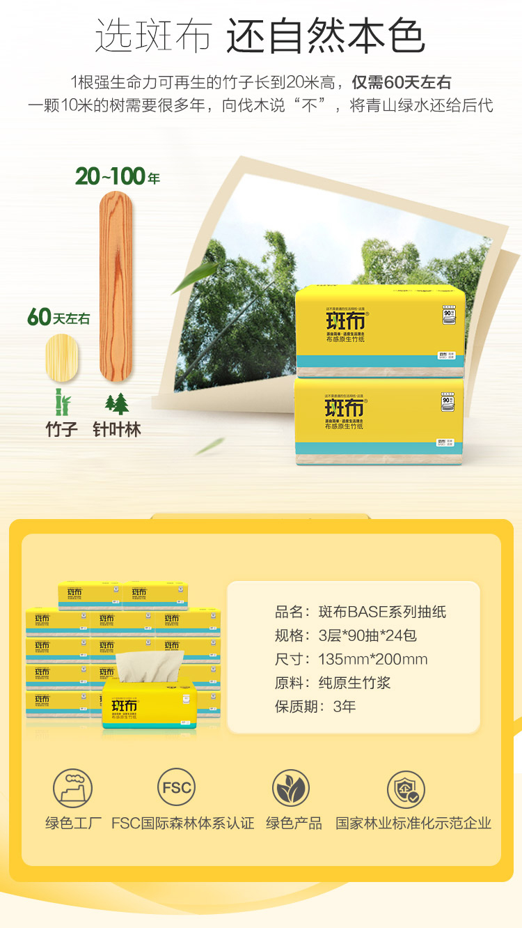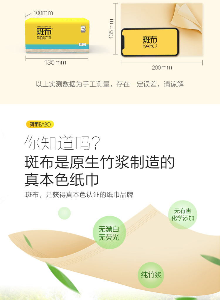 这款BABO 斑布 BASE系列本色抽纸,优选四川本地慈竹制浆,天然发酵原生布感竹浆纸,竹浆原色,不添加漂白剂、荧光剂,纤维长度更长,不掉屑,湿水不易破。规格:200*135mm