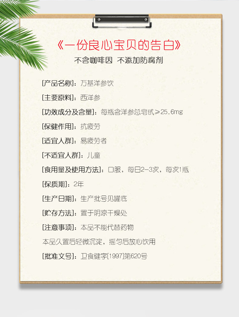 这款万基西洋参口服液饮品,是一款抗疲劳补元气的功能饮料,主要原料就是西洋参,每瓶中含洋参总皂苷≥25.6mg,具有提神醒脑,调节免疫,养身强体力,抗疲劳的保健效果。