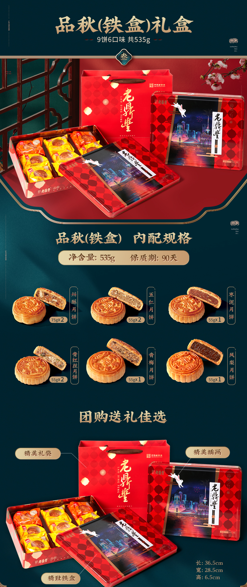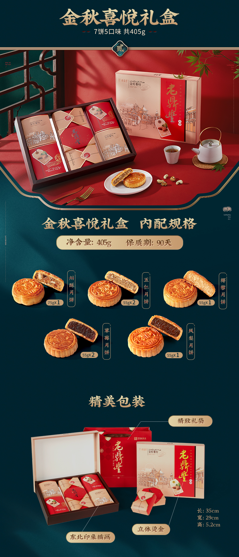 这款 老鼎丰 月饼礼盒 7饼5味 405g 保质期 90天。包含:川酥月饼*1、五仁月饼*2、椰蓉月饼*1、草莓月饼*2、凤梨月饼*1。