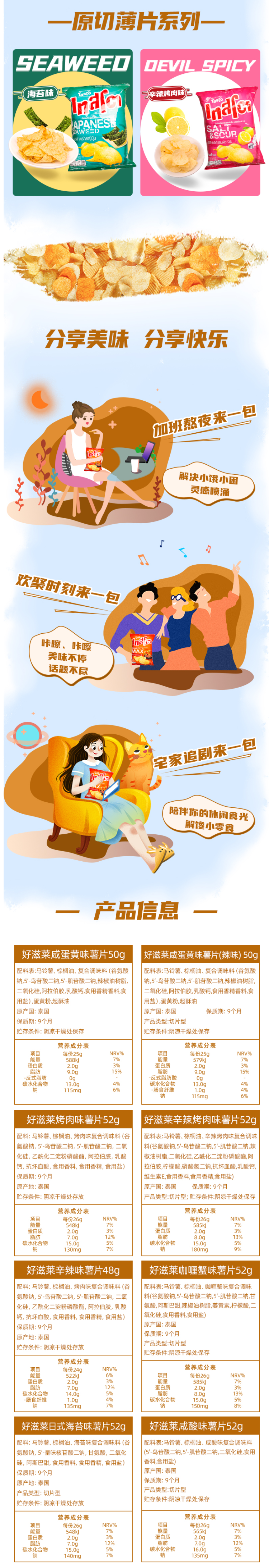 这款好滋莱薯片是泰国进口的,选用当地优质马铃薯配合植物油,真薯原切,薄薯劲脆。