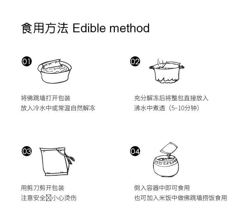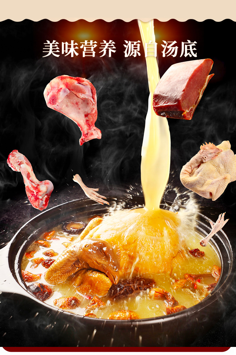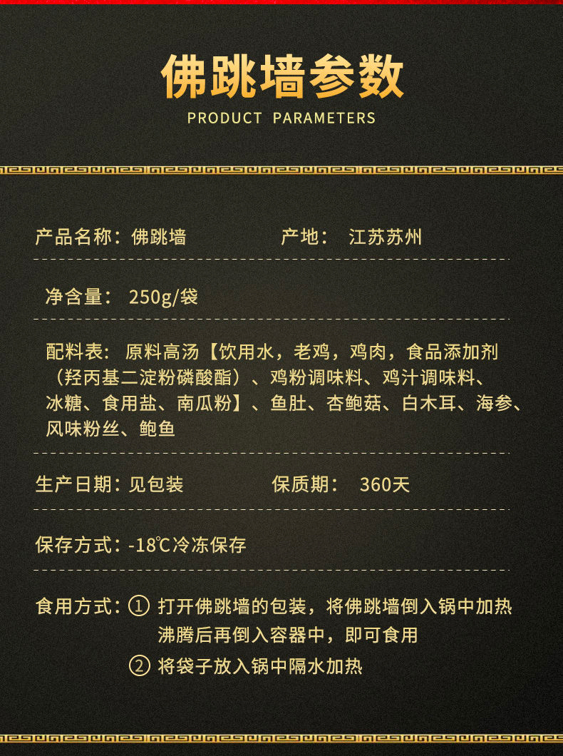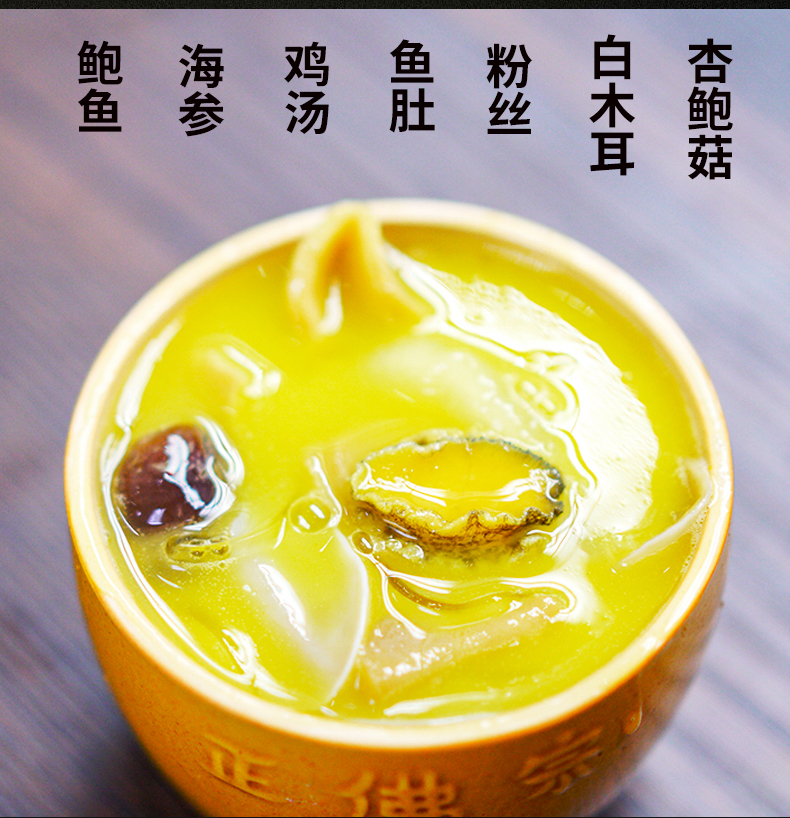 这款佛跳墙是单人份,每份250g,买回家加热即食即可,非常方便。精选食材,鲍鱼、海参,杏鲍菇,鱼肚、白木耳等食材,高汤熬制,加热即食,入口软滑,完整饱满,营养丰富,口感鲜美。