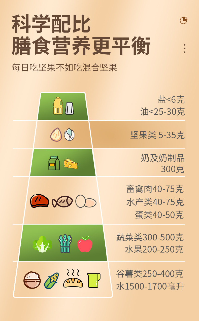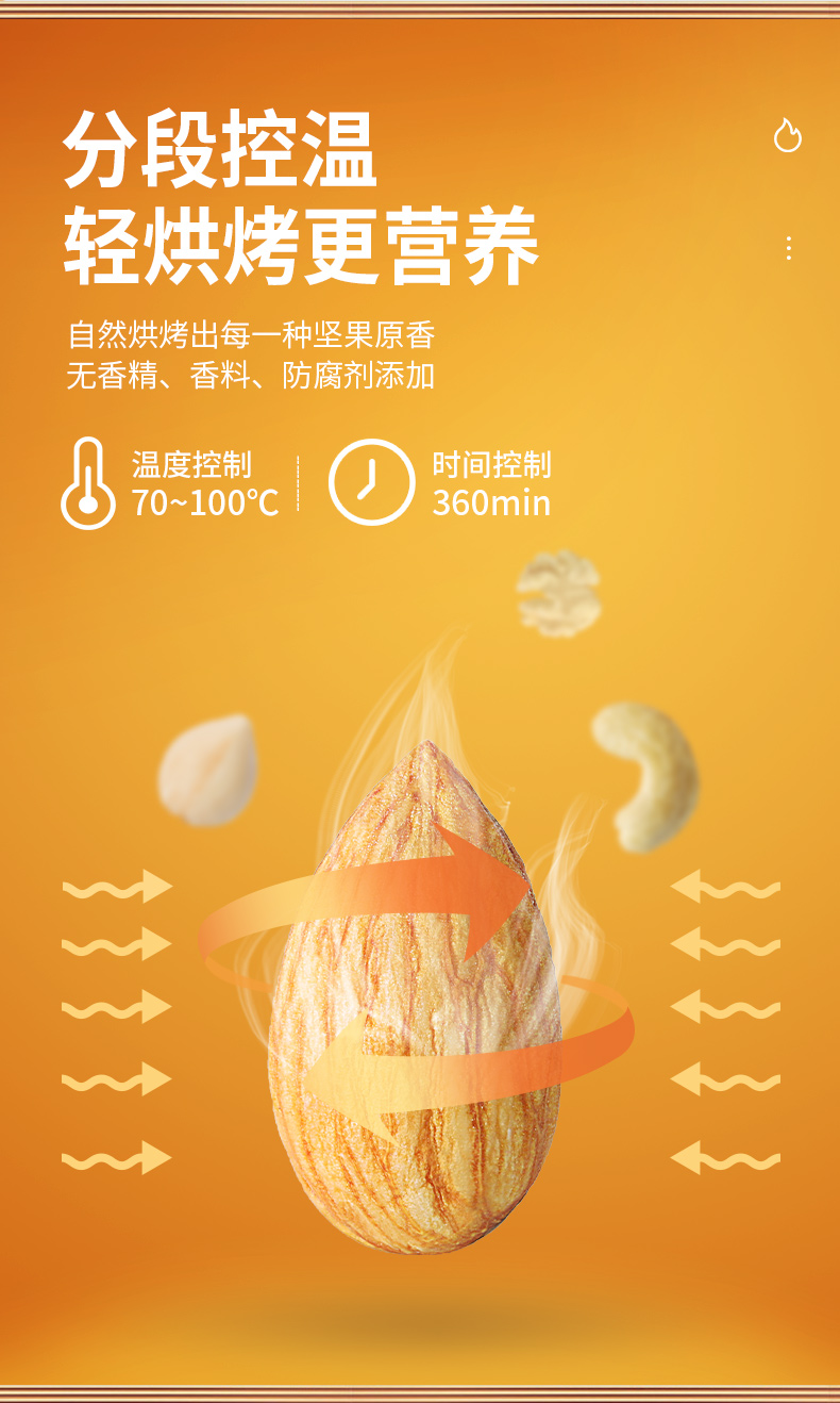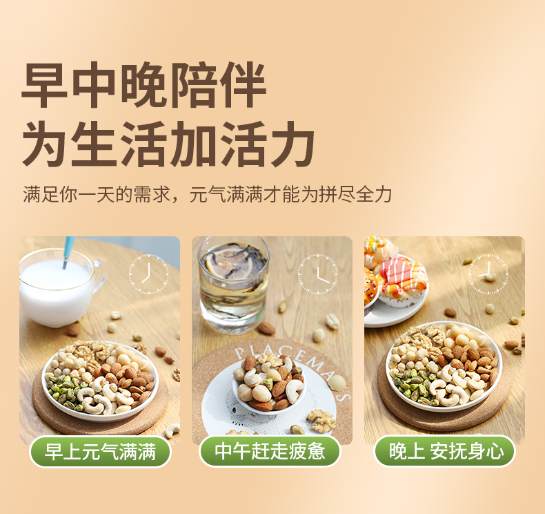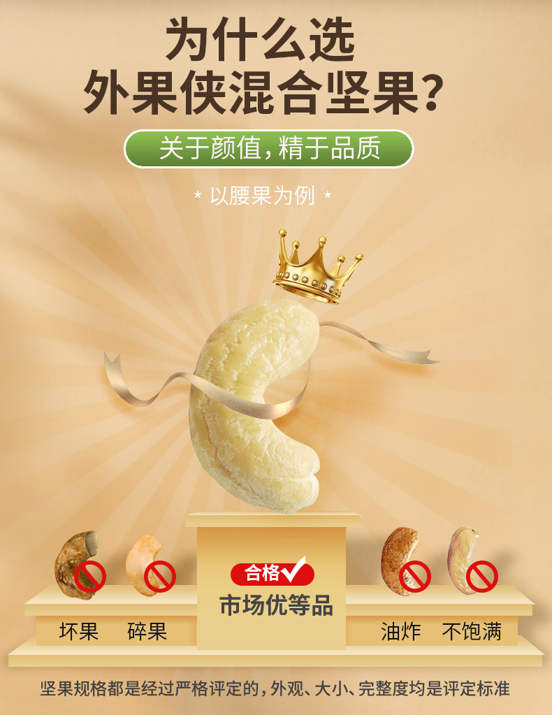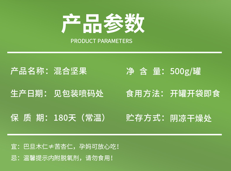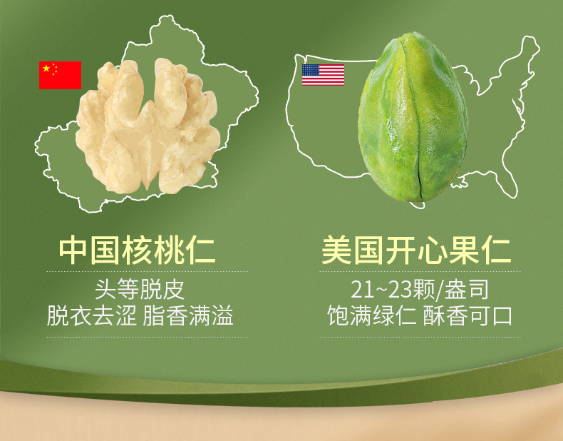 包含:土耳其榛子仁 11-13mm、越南腰果仁WW320优等品、美国巴旦木仁23-25颗/盎司、澳洲夏威夷果直径≥20mm、中国核桃仁、美国开心果21-23颗/盎司