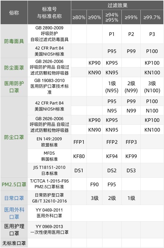 ▲不同标准口罩过滤效果对比,钟南山院士推荐的医用外科口罩,如果放在上表中,过滤效果大约为30%。