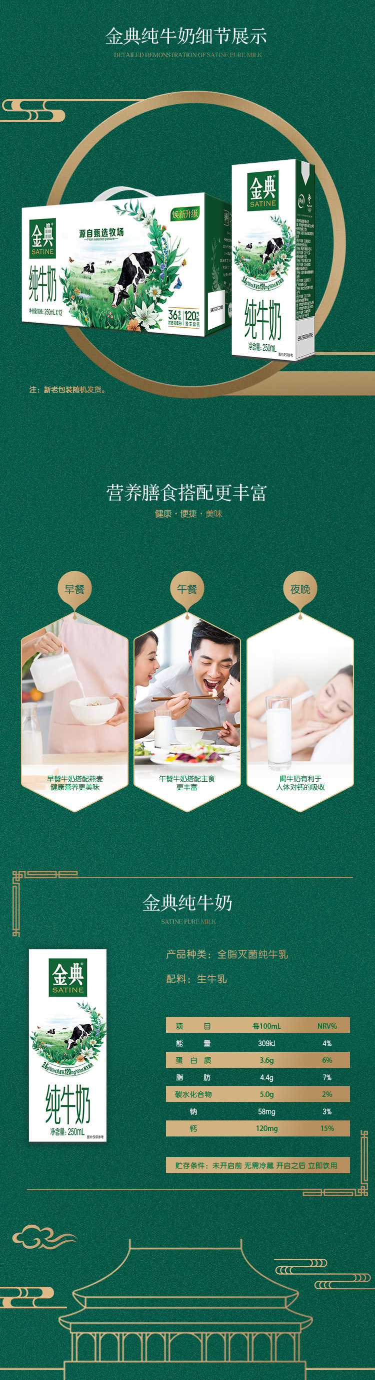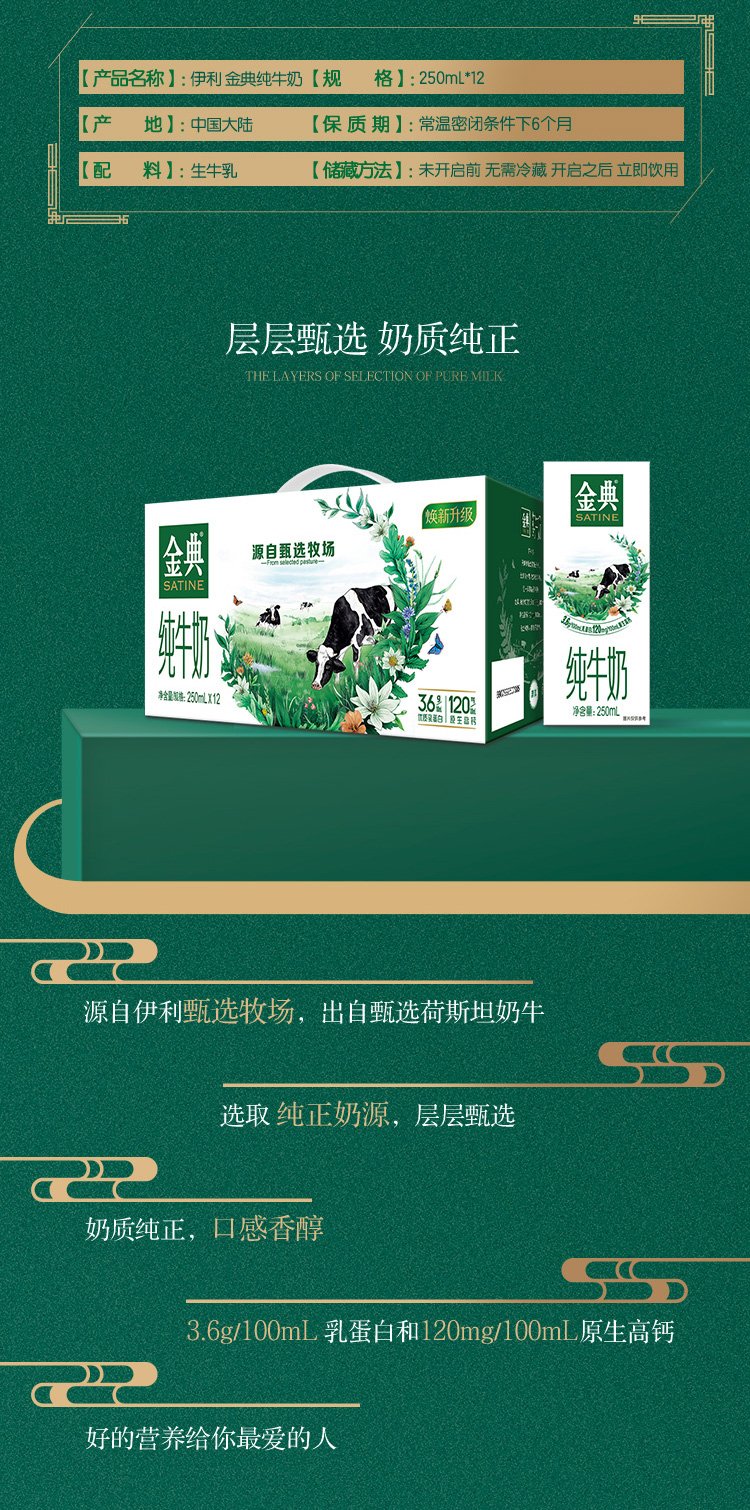 这款金典牛奶源自伊利甄选牧场,奶源无污染,确保绿色健康,优质乳蛋白高于3.3g,营养丰富,唇齿留香。
