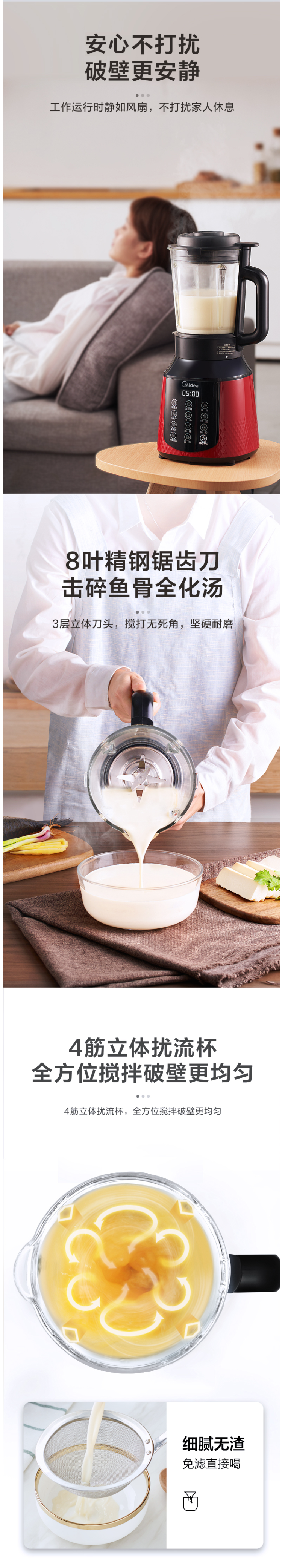 搅拌杯是加厚高硼硅玻璃制成,结构更牢固不易碎,耐高温骤冷骤热不易炸裂,可冷热双打。IMD操作界面,带12小时提前预约功能,制作完成后自动保温4小时,非常贴心。