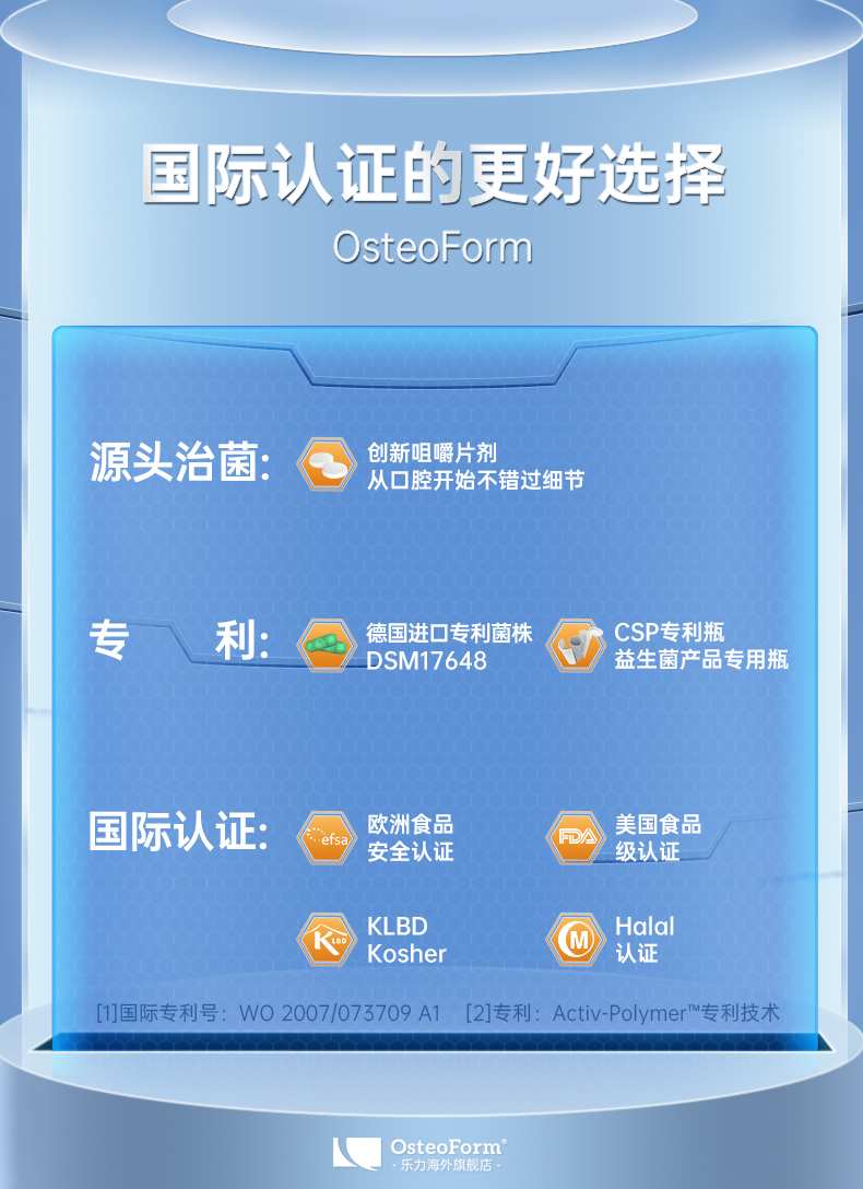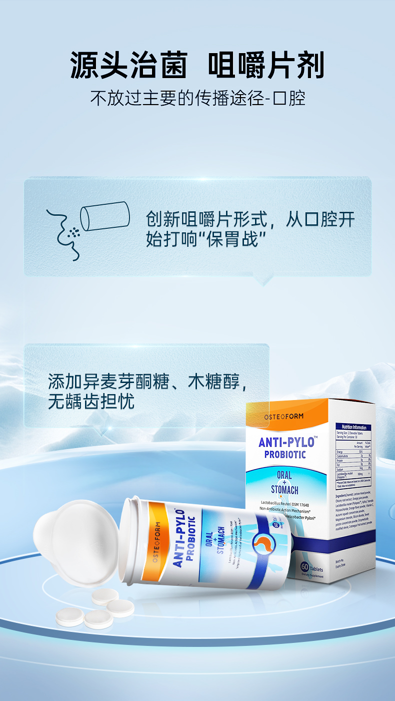 这款美国OsteoForm 乐力 益生菌养胃咀嚼片,规格60片/瓶,产品通过efsa欧洲食品安全认证、美国FDA食品级认证、KLBD Kosher认证及Halal认证,经临床验证,能有效抑制HP幽门螺杆菌,采用德国Pylopass®罗伊氏乳杆菌,能捕捉胃中的幽门螺杆菌HP,并特异性聚合,再经过消化道排除体外,非抗生素,靶向清除,无副作用及耐药性,可长期服用。另外添加养胃精粹:菊苣根提取物(菊粉)增殖益生菌,协同促进口腔肠道菌群健康,银耳多糖保护胃黏膜,粮食果粉养胃更健康。创新咀嚼片形式,从口腔开始有效赶走幽门螺杆菌,添加异麦芽酮糖、木糖醇,无龋齿担忧。包装瓶采用适用于益生菌产品的三相活性聚合物技术CSP专有瓶,阻隔湿气,能长期保存。