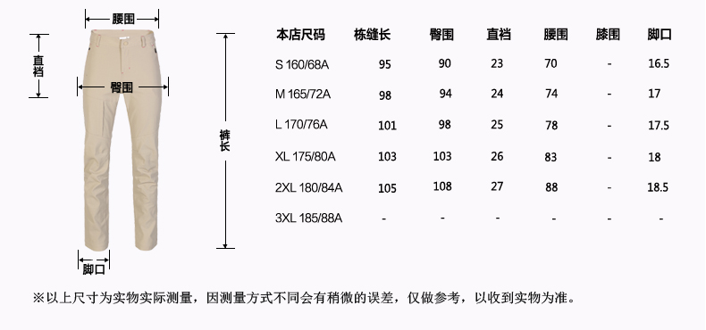 速干:这款速干裤使用靠谱的抗撕裂速干尼龙面料,耐磨抗撕裂不易破损。尼龙纱线呈多股中空状,中空管道快速吸水快速向四周分散,加大挥发面积达到快干,通常在雨天淋湿后不到1小时就能干。这种面料舒适度也很好,上身不闷不潮,出汗时不沾身,是户外天热时很舒适的面料。