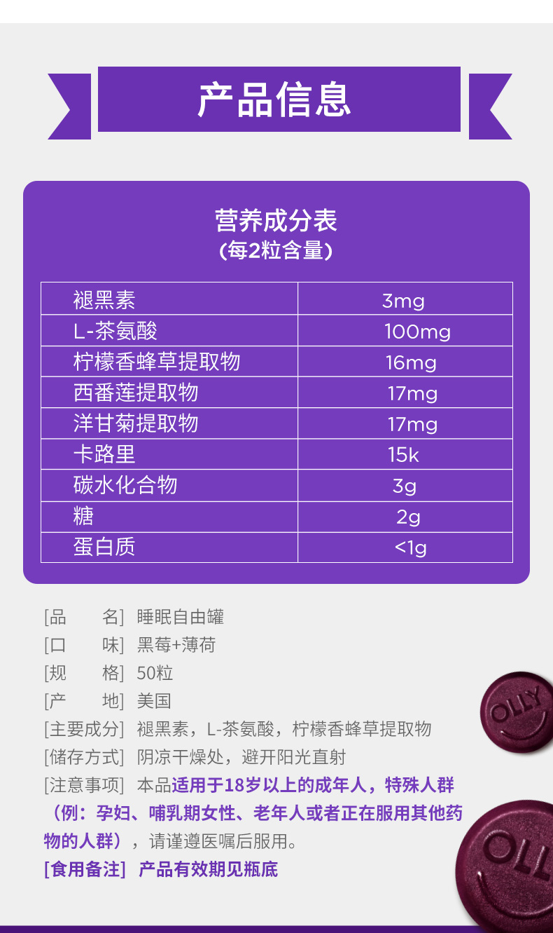 采用草本四合一升级配方,褪黑素、L-茶氨酸、西番莲提取物、柠檬香蜂草、洋甘菊,无人造香精、麸质过敏源、人工色素,对人体无害、无依赖。黑莓+薄荷的口味,清甜好吃。