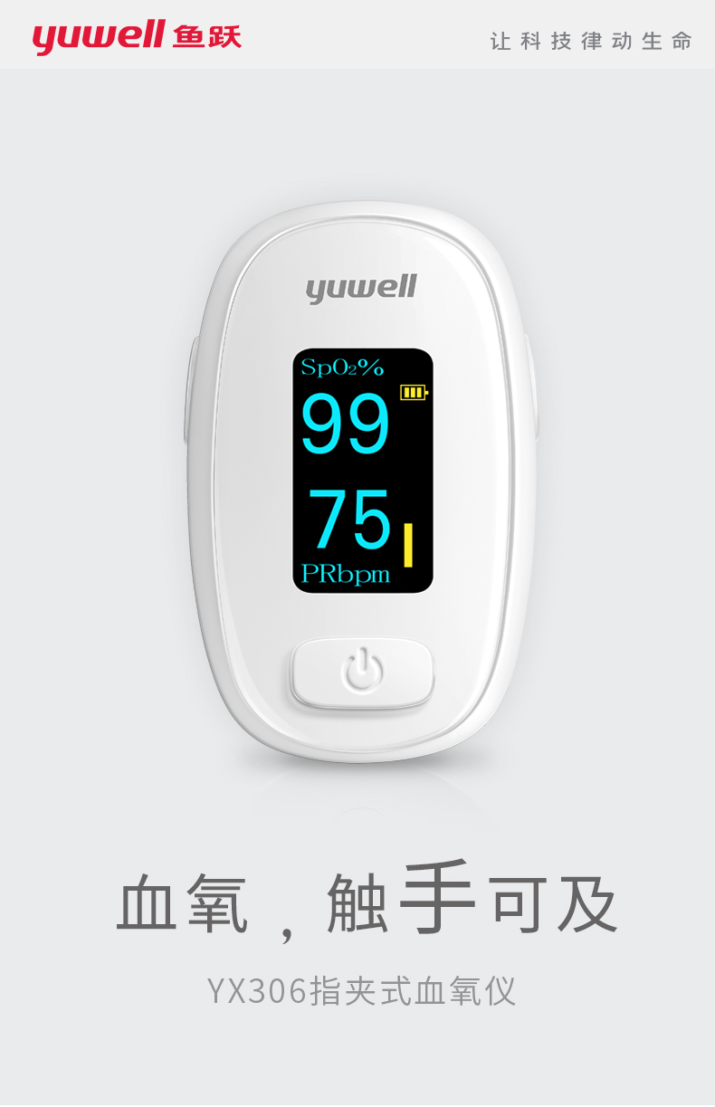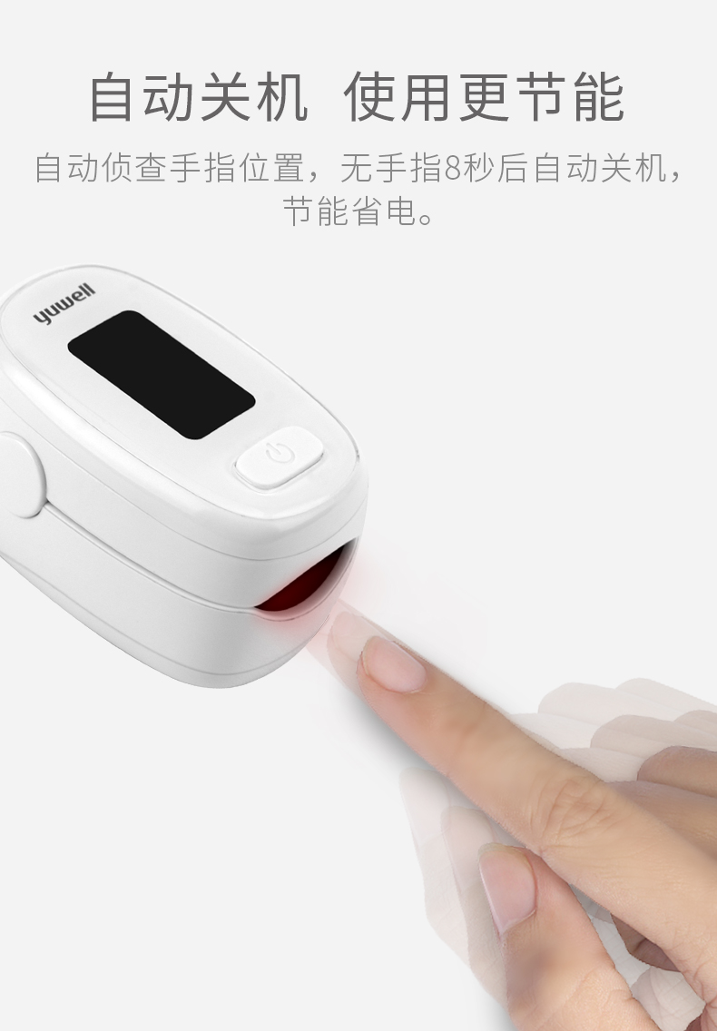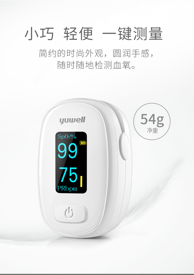 这款鱼跃 医用指夹式血氧仪,能随时随地的检测人体的血氧浓度和脉搏,将硅胶的柔软特性与人体工程学相结合,指模一键成型,贴合性好,不夹手。
