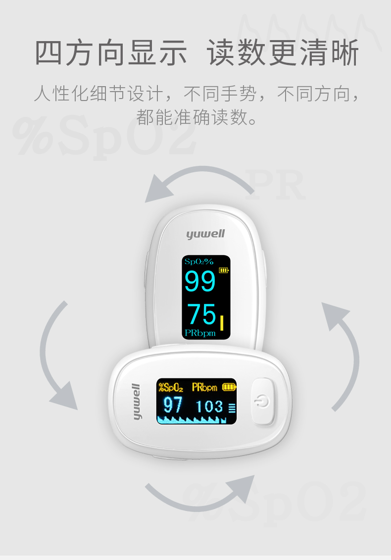 四向显示,不同方向都能正确清晰读数。自动侦查手指位置,无手指情况下8秒后自动关机。