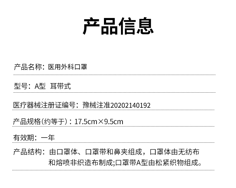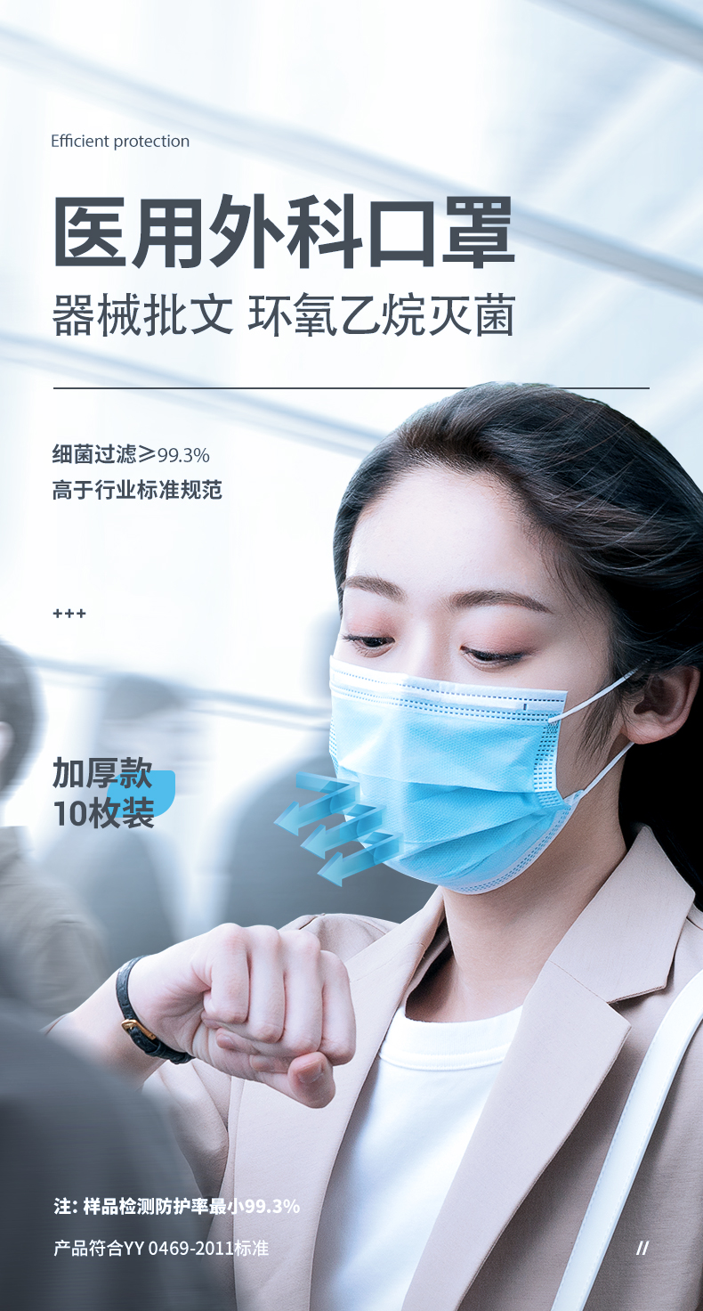 这款一次性医用外科口罩,环氧乙烷灭菌,25g/m²加厚熔喷布,细菌过滤大于99.3%(三个样品最小值),远远高于行业标准规范95%,虽然价格相比普通医用要贵一些,但是拥有更严苛的防护!建议人员流通大、存在潜在风险地区使用。
