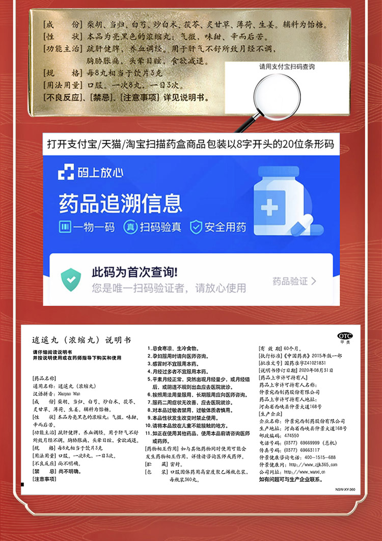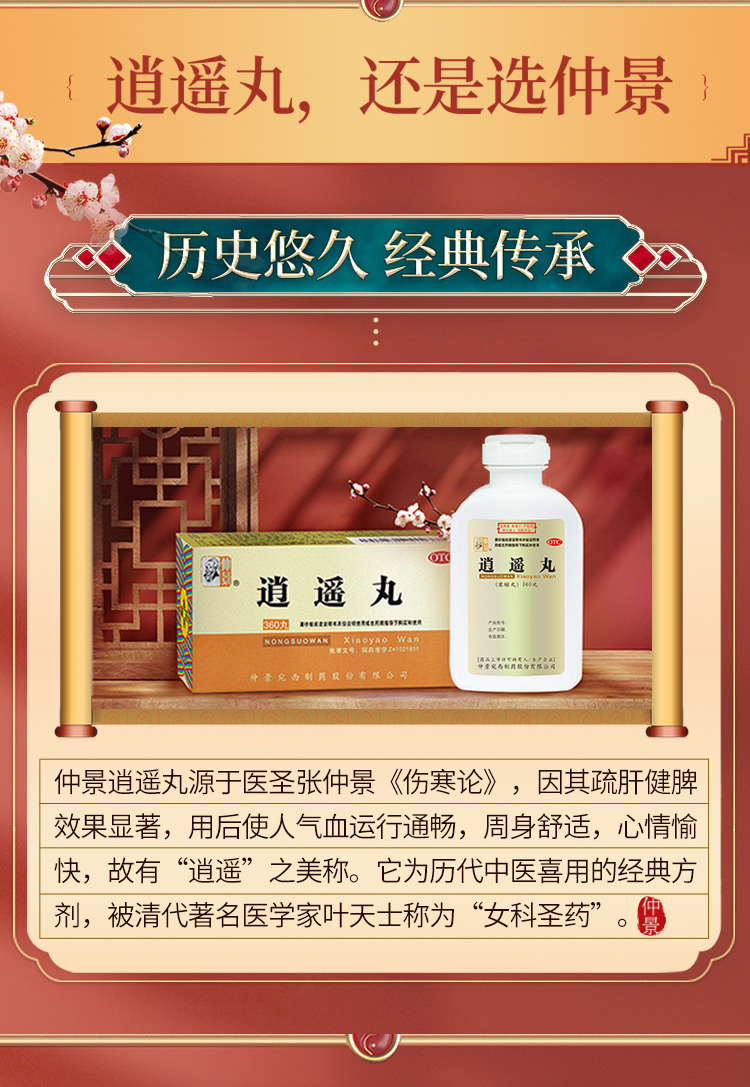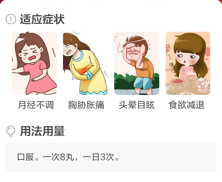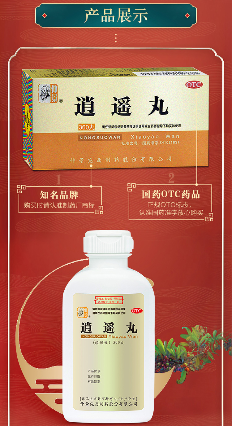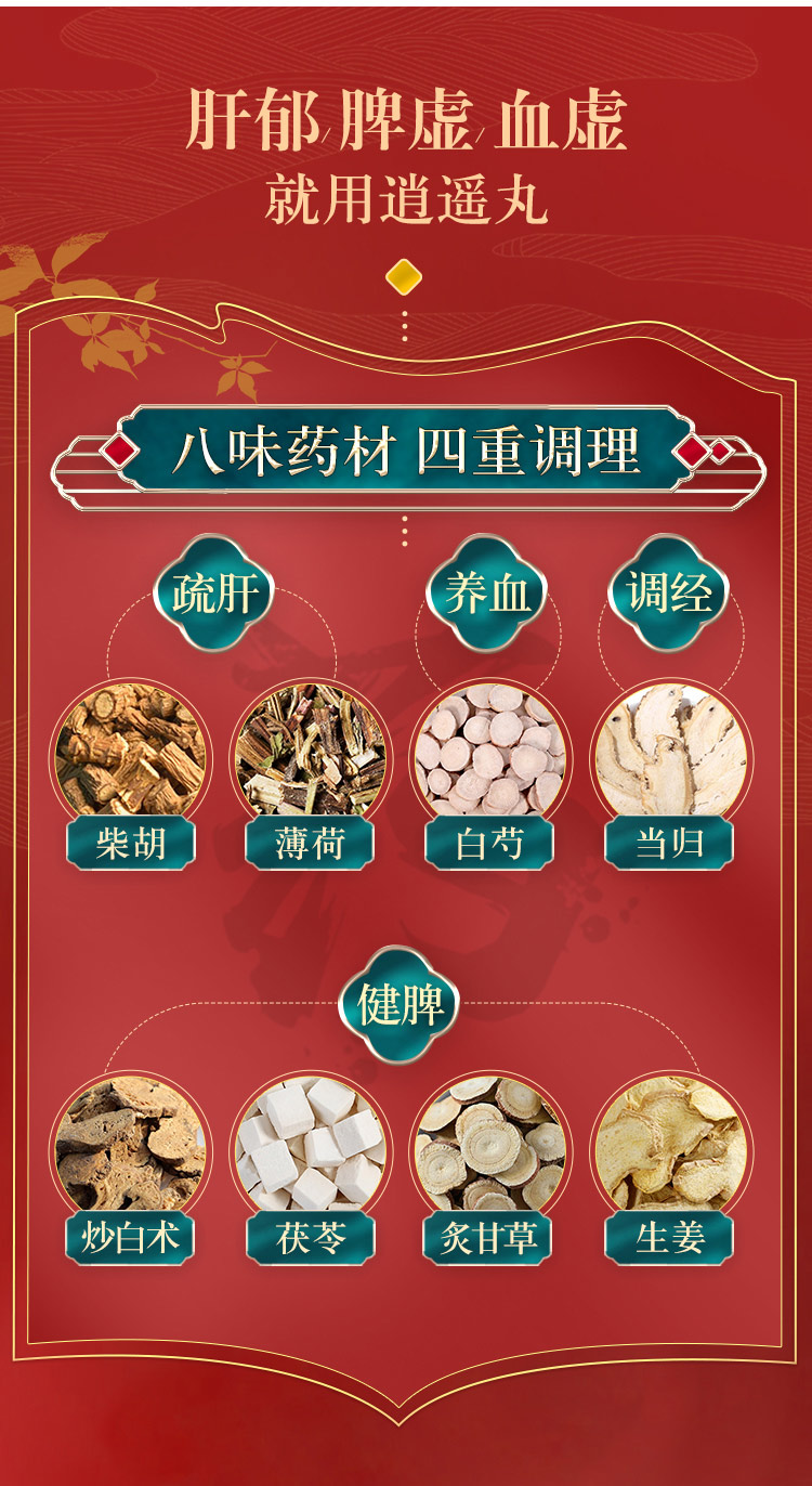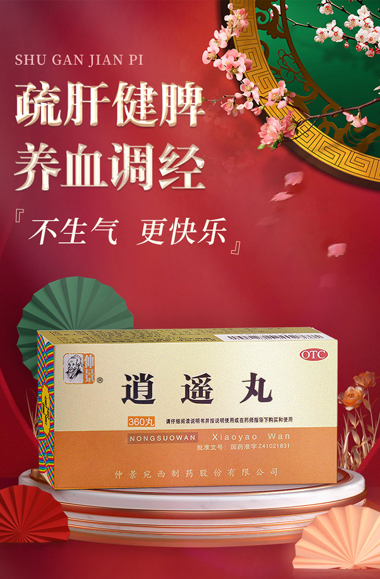 这款仲景 逍遥丸,主要成分是柴胡、当归、白芍、炒白术、茯苓、炙甘草、薄荷、生姜,辅料为饴糖,能疏肝健脾,养血调经,用于肝气不舒所导致的月经不调,胸肋肿痛,头晕目眩,食欲减退。