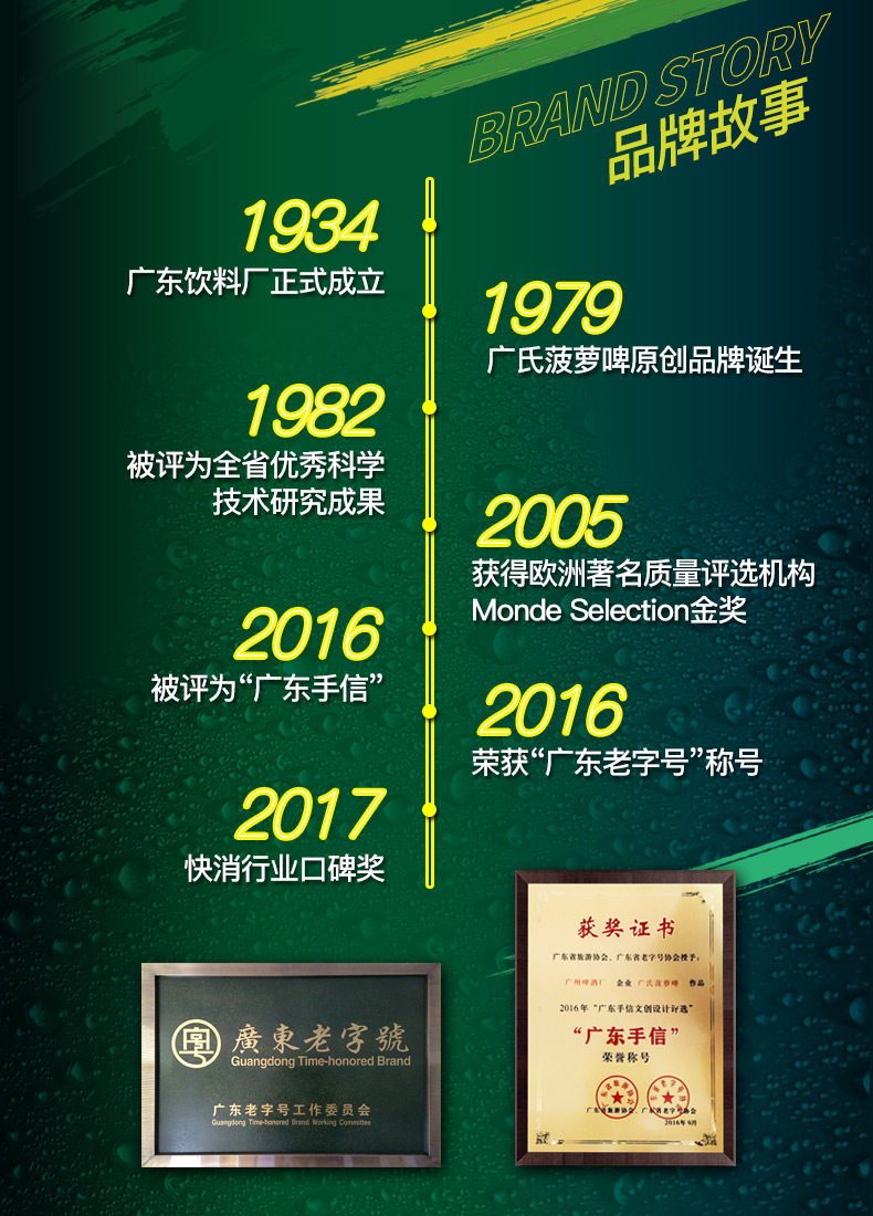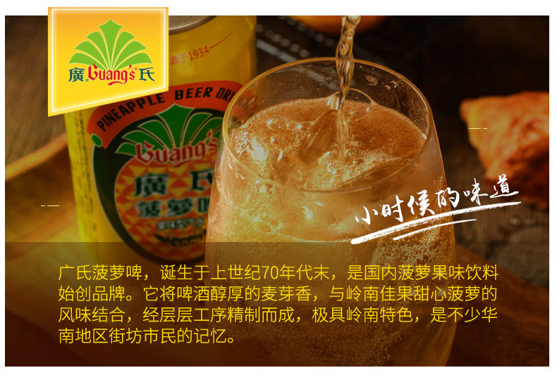 菠萝啤酒中最著名的莫过于广氏菠萝啤,始创于上世纪的七十年代末。“菠萝啤”以麦芽、大米、砂糖、酒花等为原料,将啤酒醇厚的麦香,与岭南优质甜心菠萝完美结合,经蒸煮、糖化、发酵,并以科学方法精制而成,形成了果香浓郁、酸甜适中、营养丰富,口味清新怡神的独特风格,