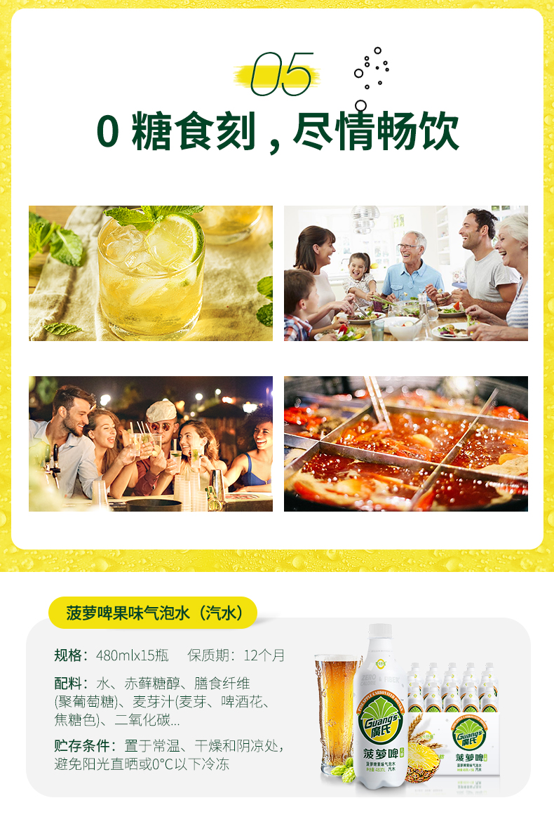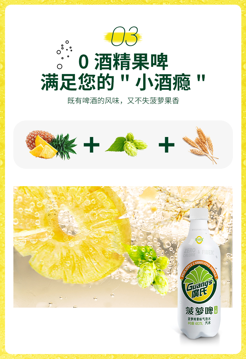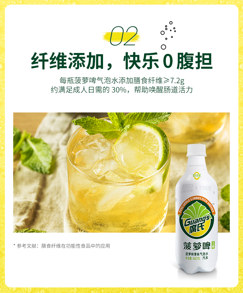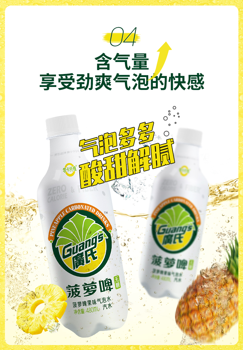 这款 菠萝啤果味气泡水,采取更加健康新配方,0蔗糖0脂0卡,赤藓糖醇代替蔗糖,甜味不减不伤牙齿,每瓶添加7.2g膳食纤维,唤醒肠道活力更健康,丰富气泡,冰镇后饮用更加激爽,既有啤酒的风味,又不失菠萝果香,女生聚会也可放心喝~~