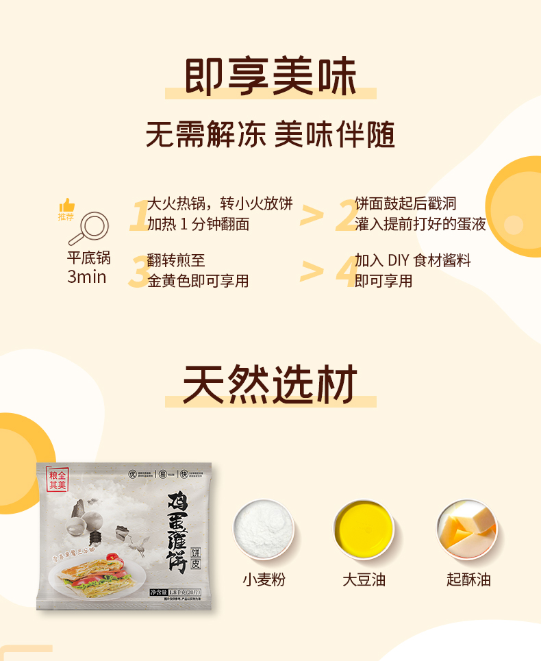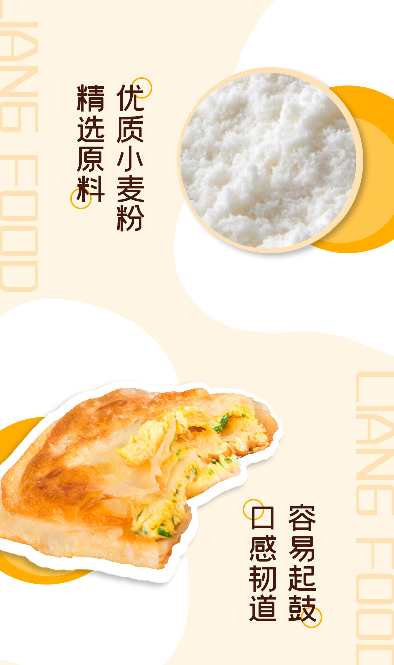 鸡蛋灌饼是用鸡蛋、面粉制作的一道小吃,它是源于河南信阳的特色传统名点,深受当地居民喜爱。把鸡蛋液灌进烙至半熟的饼内,继续煎烙后烤制而成,饼皮酥脆蛋鲜香。粮全其美 鸡蛋灌饼半成品饼皮 使用天然小麦粉、大豆油、起酥油,制成的饼皮口感韧道,容易起鼓。
