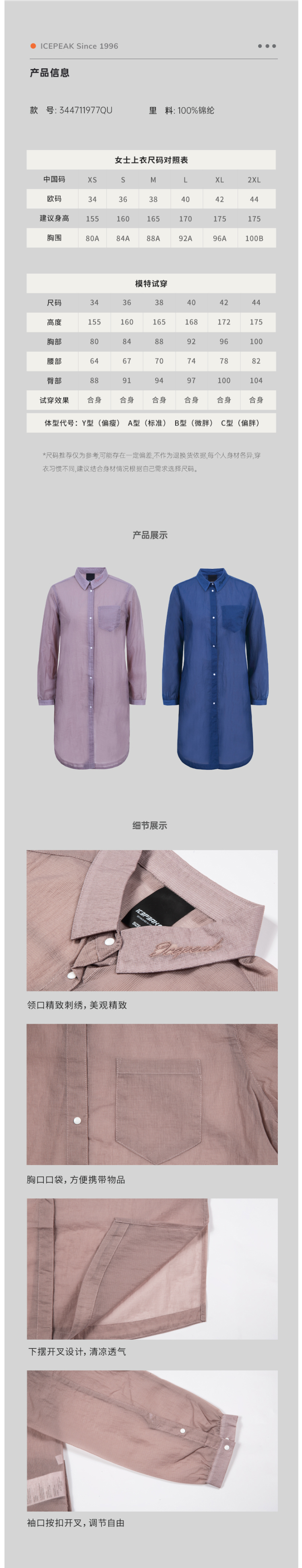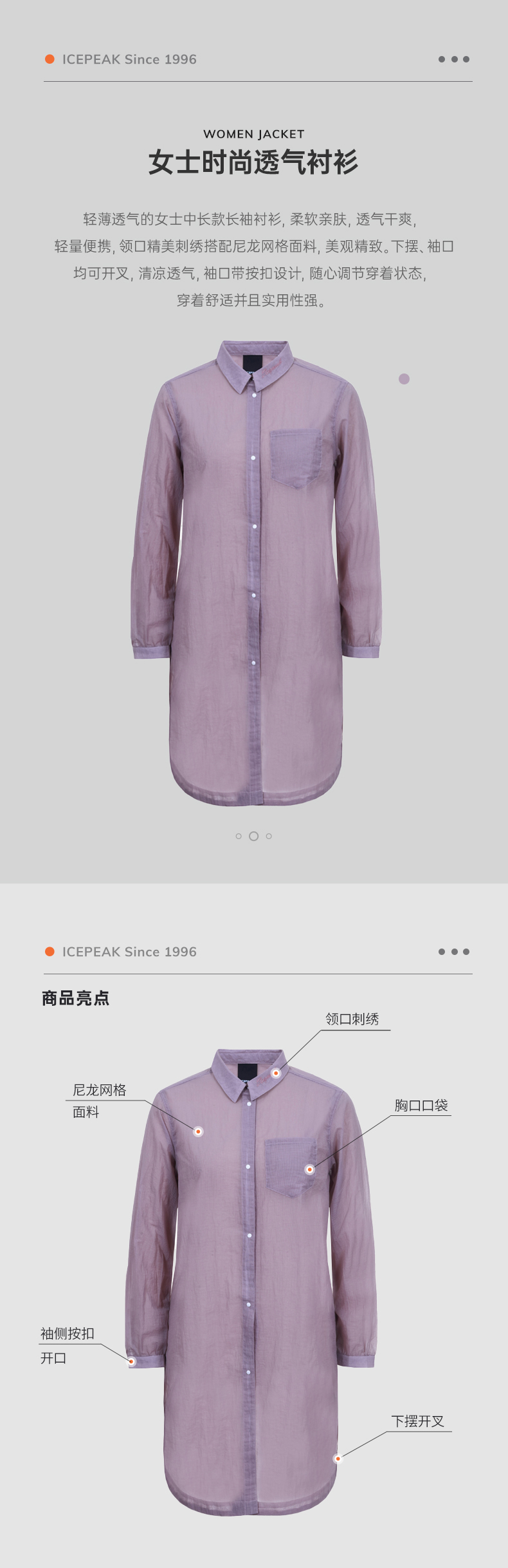 这款艾斯匹克icepeak 女轻薄透气中长款衬衫,使用100%超细锦纶面料,轻薄速干透气。中长款设计,能当睡裙穿了。领口有刺绣,美观精致。下摆、袖口均可开叉,清凉透气。