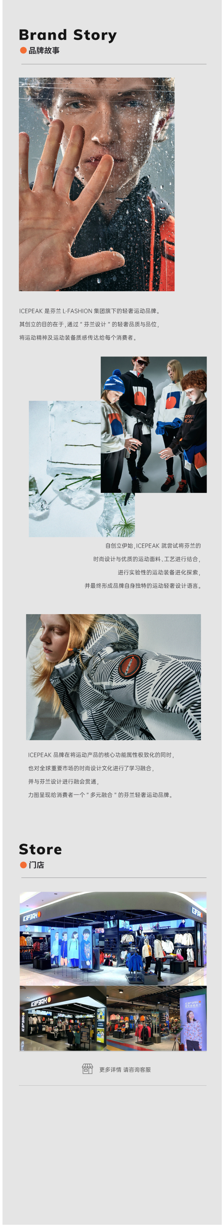 icepeak/艾斯匹克是来自芬兰的轻奢运动品牌,也是芬兰最大的户外品牌之一,拥有百年的历史。本身是属于芬兰第一大服装集团公司L-FASHION旗下的户外运动品牌,同时也是芬兰奥运国家队官方合作品牌。