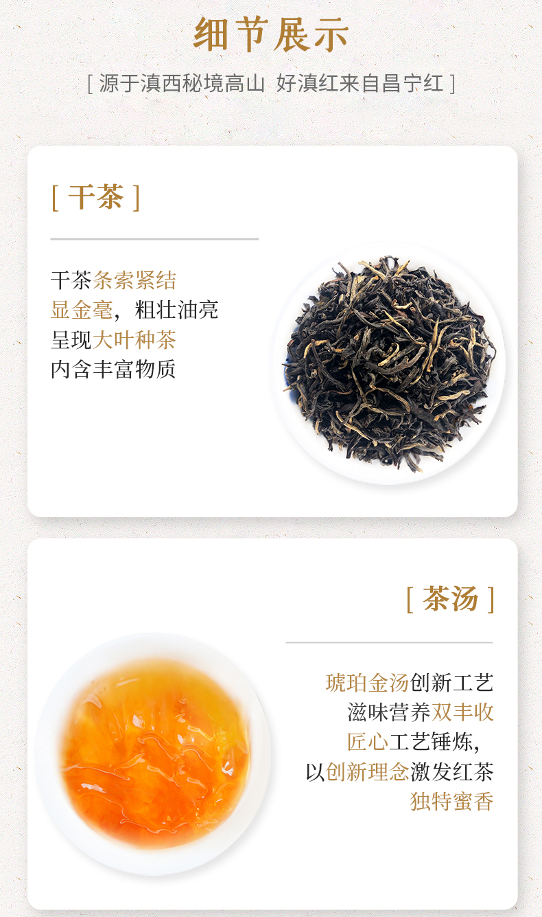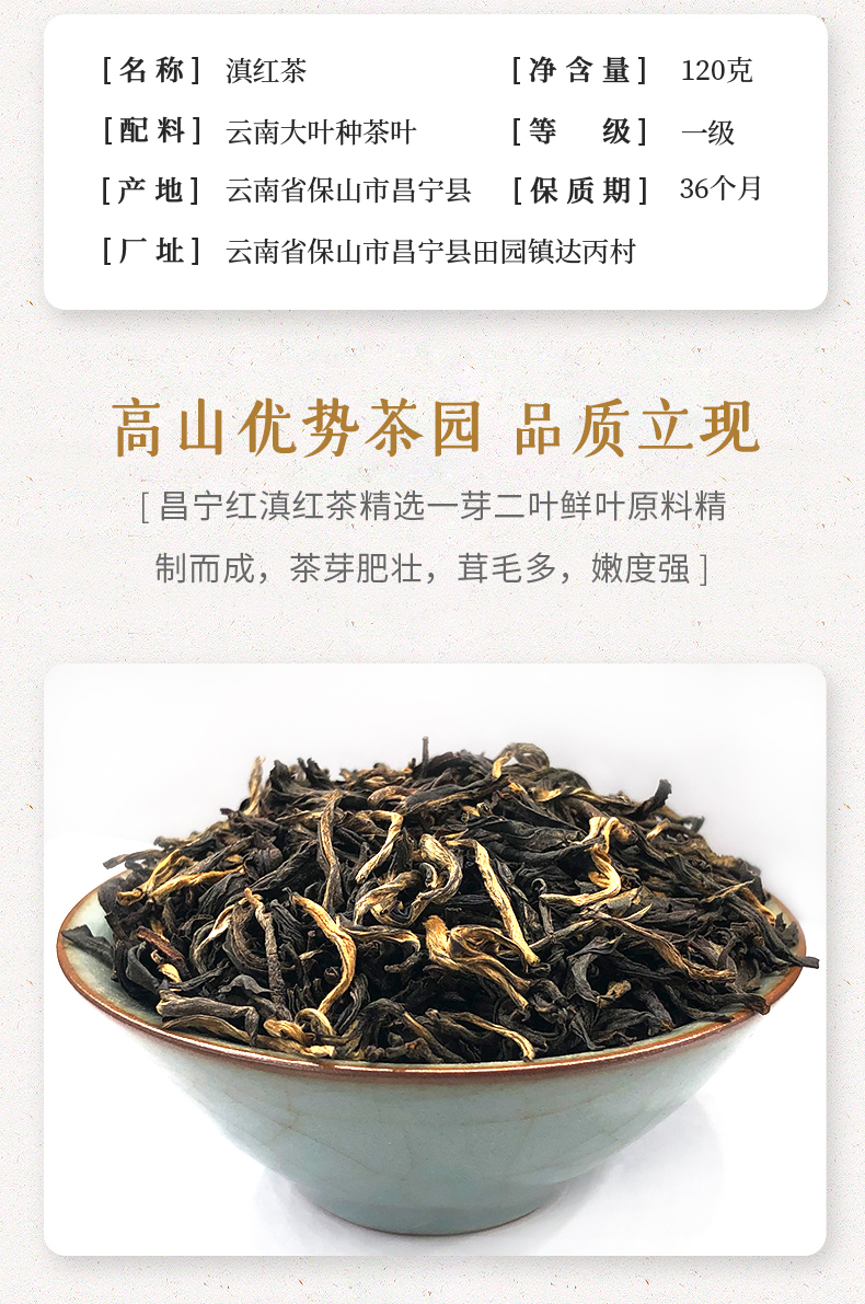 地道云南一级滇红,2021新茶,昌宁原产,高山生态茶园精选一芽二叶鲜叶原料精制而成,茶芽肥壮,茸毛多,嫩度强;干茶条索紧结显金毫,粗壮油亮,呈现大叶种茶内含丰富物质,琥珀金汤、温润香甜、富含茶黄素,10-20泡仍有余香余味。