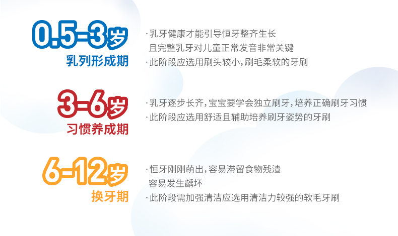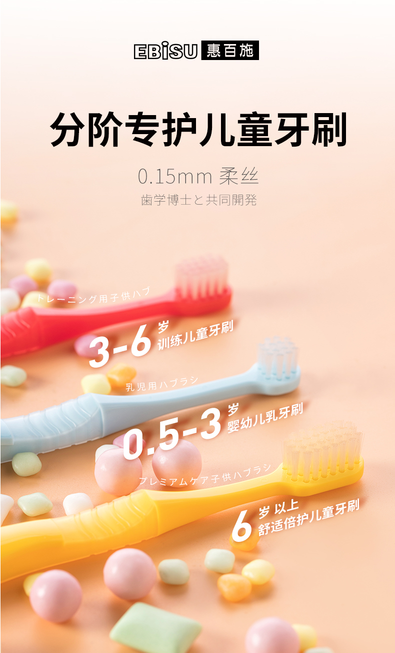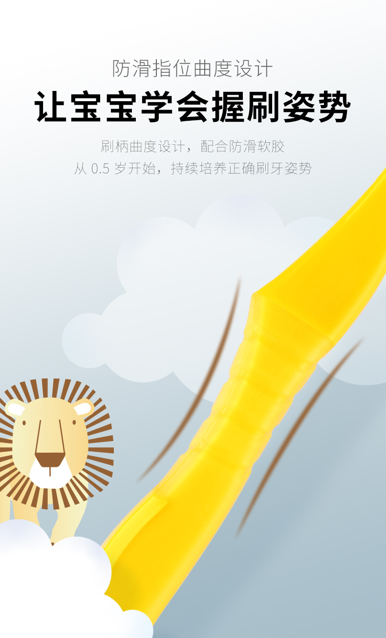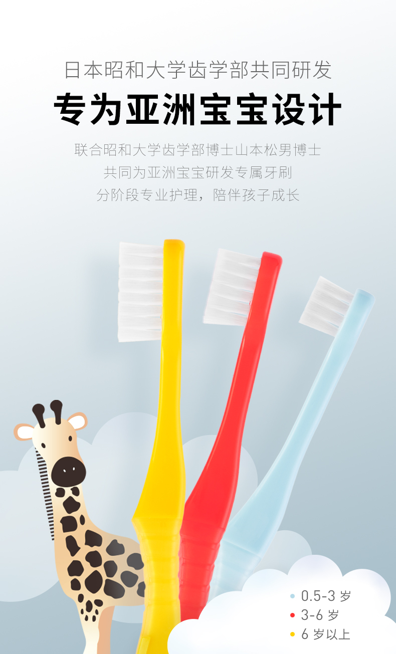 这款牙刷分为3岁以下、3-6岁和6岁以上儿童使用,是日本昭和大学齿学部专门为亚洲宝宝设计,采用0.15mm的0.1级柔软刷丝,有效避免刷牙刺痛,刷牙舒适又洁净,刷柄曲度设计,配合防滑软胶,帮助宝宝学会正确的刷牙姿势。