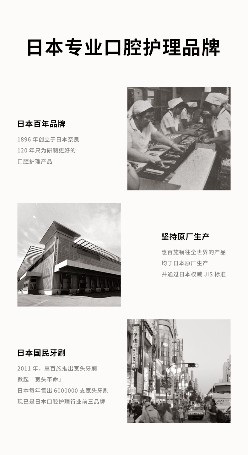 惠百施的牙膏远不如他的牙刷。惠百施的牙刷一直被网上评论为最好用的牙刷,也是去日本代购的爆款之一。惠百施是一个只关注与刷牙的企业,最有名的产品就是牙刷和刮舌器,有一种100多年只为做好牙刷的工匠精神