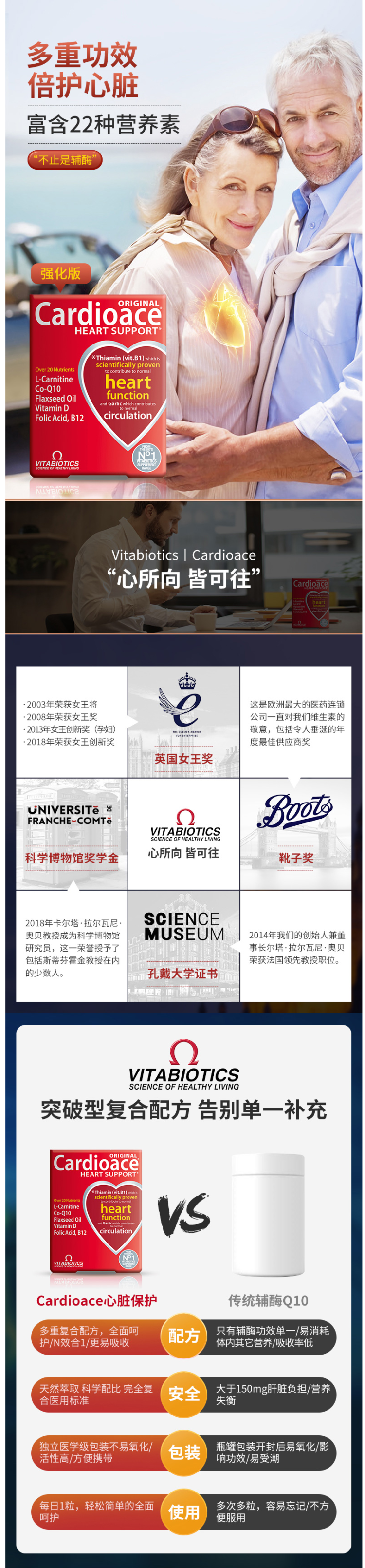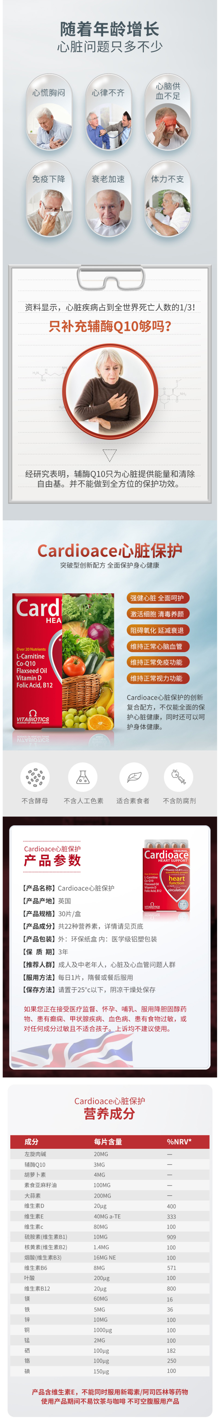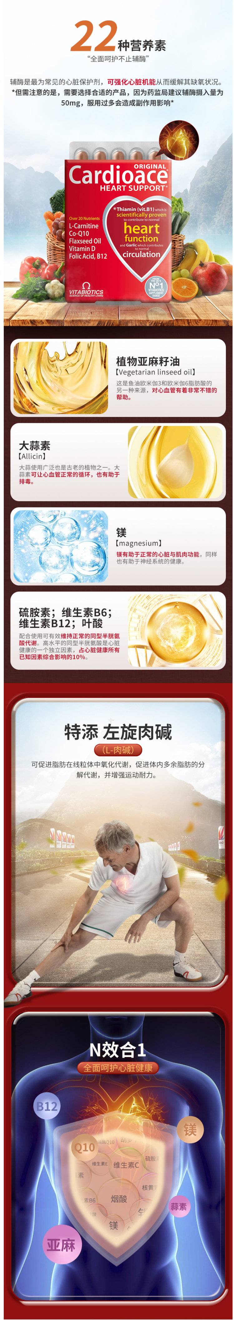 这款维百莱旗下Cardioace辅酶Q10,英国原装进口,使用复合配方,全方面呵护心脏。主要成分是辅酶Q10、植物亚麻籽油、大蒜素、镁、硫胺素、维生素B6、维生素B12、叶酸等22种营养元素,除了呵护心脏,同时呵护全身健康。