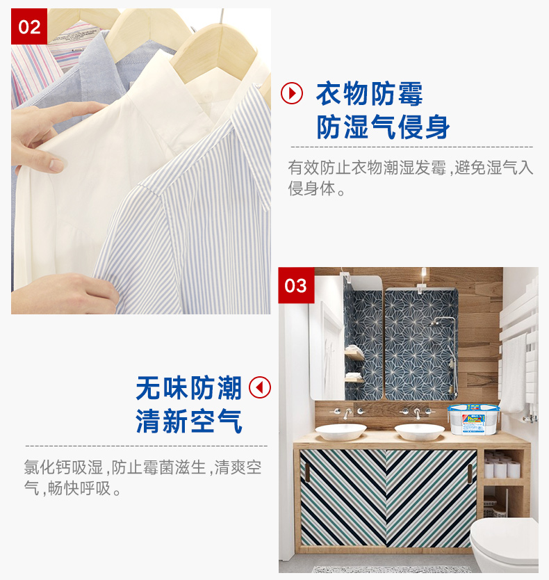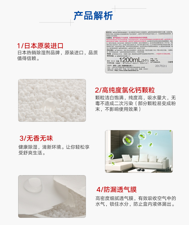选用高纯度的氯化钙颗粒,当需要溶解每一颗颗粒时,都要有大量的水汽,这样就能达到长时间持续除湿的效果。盒子表层有高品质的防漏透气膜,密度细腻,锁住水汽,即使不小心反转倒置,盒内的液体也不会渗透出来。可用于客厅、卧室、衣柜、抽屉,尤其是南方雨水较多的城市或靠海的城市都可准备一些。